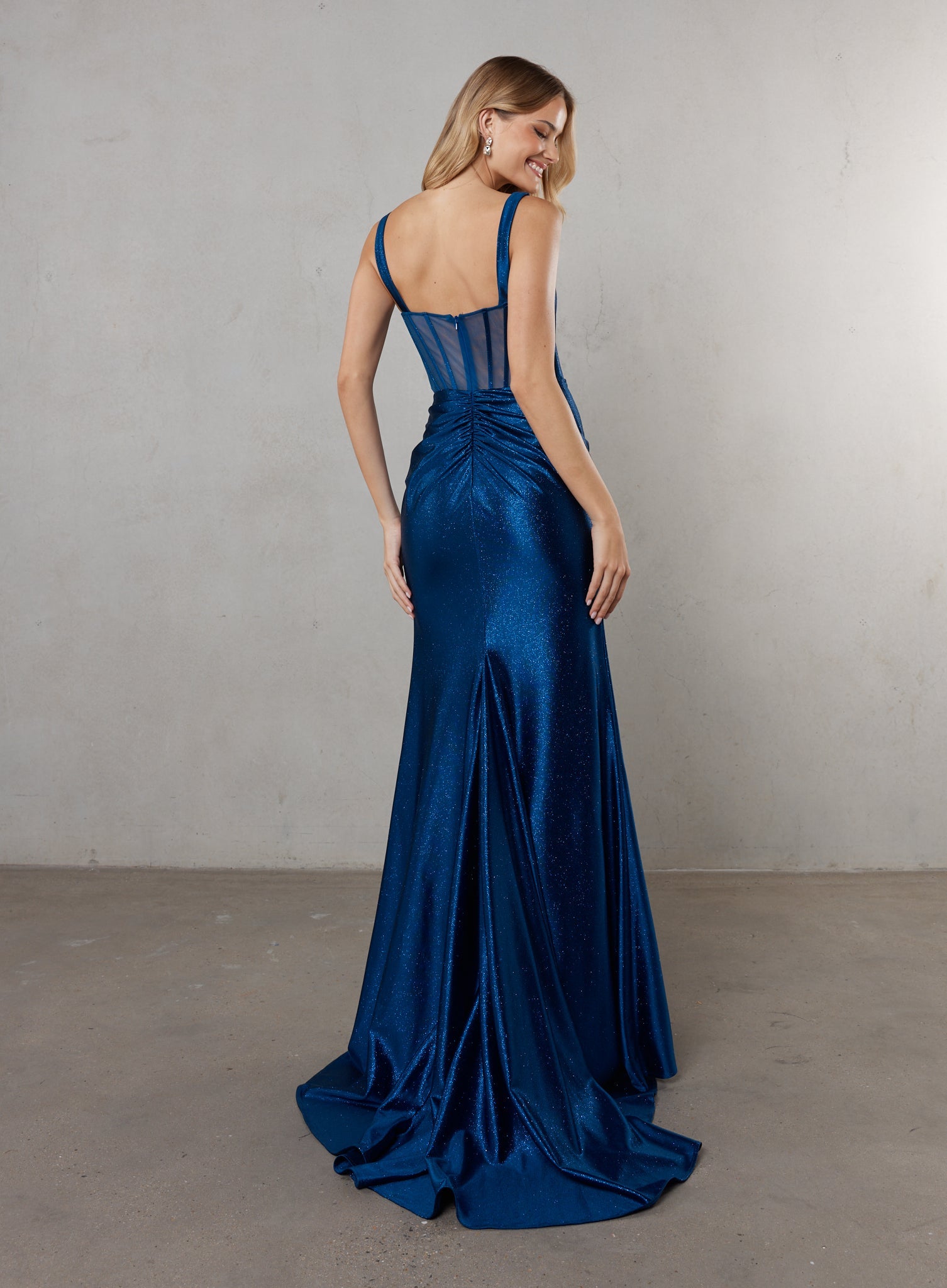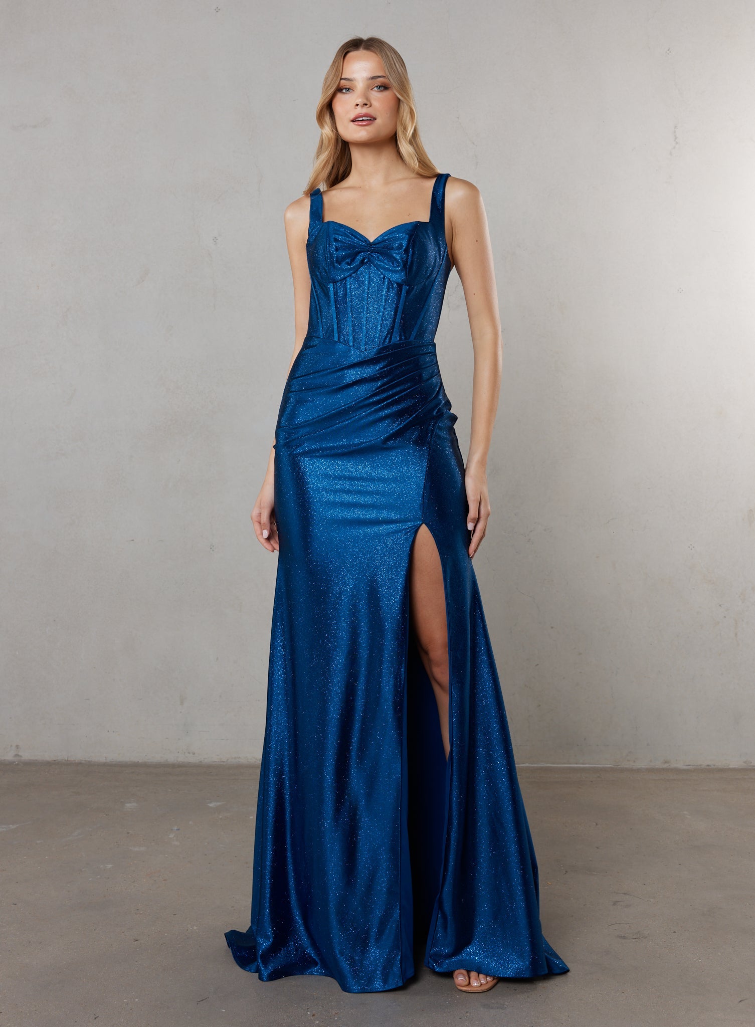 The gown’s wider straps balance elegance with ease, and the slightly flared A-line skirt flows beautifully with every step. A high-leg front split and soft drape detailing across the front and back create graceful movement and a modern allure. Finished with an invisible back zip, this gown embodies refined glamour—perfect for formal events, evening galas, and special occasions.