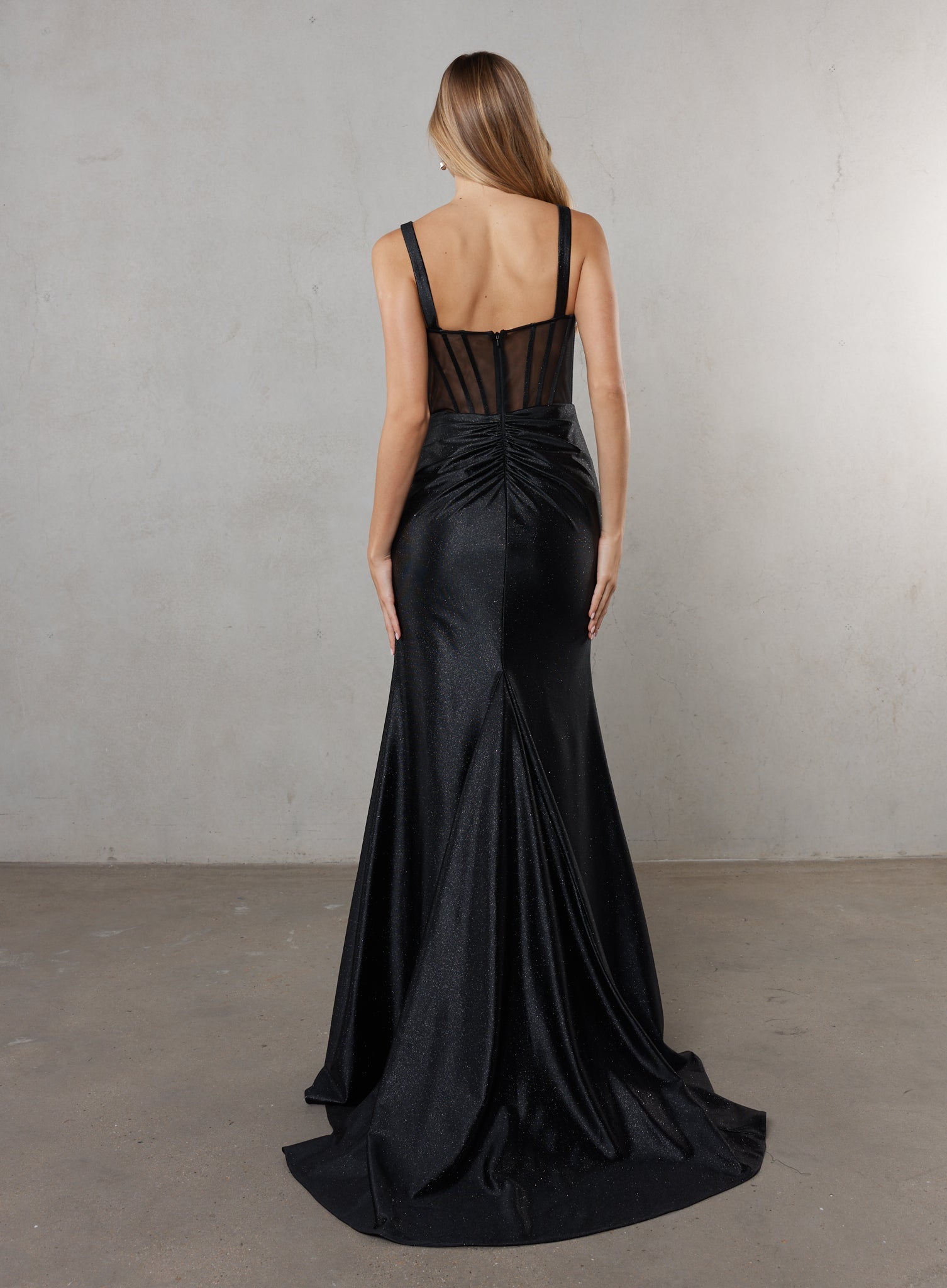 - Fitted silhouette with corset bodice and structured boning – corset lined at front and illusion at back