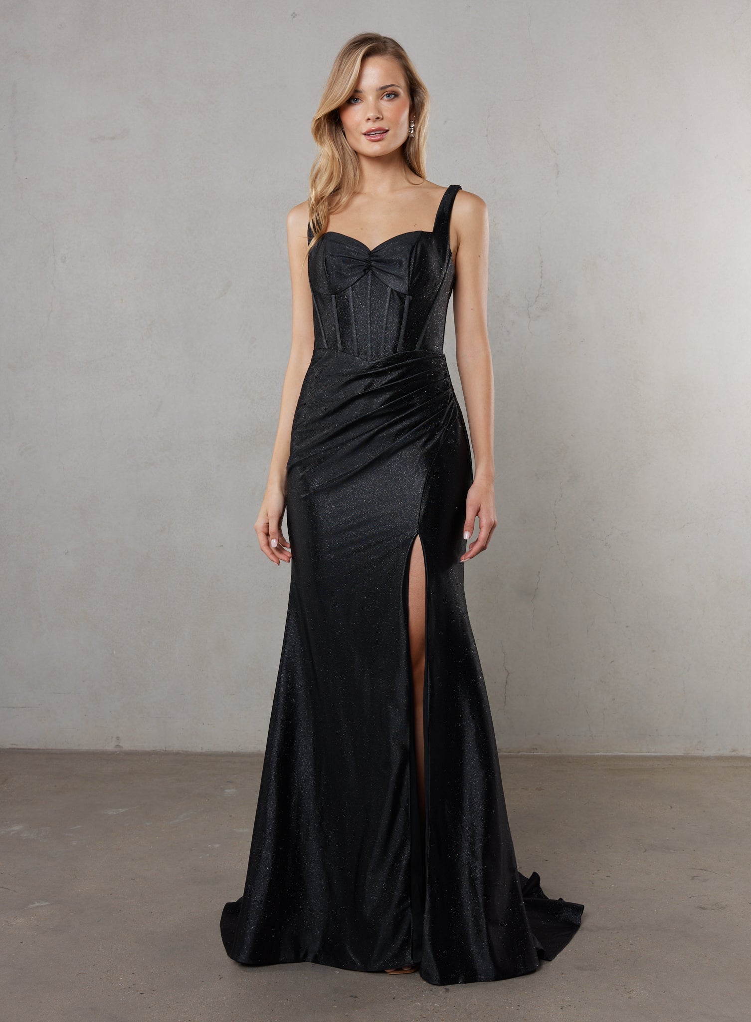 Turn heads in our Fallon formal dress by Tania Olsen Designs. The fitted silhouette features a corset bodice with structured boning, illusion back, and lined front for a flawless, supportive fit. A sweetheart neckline, highlighted by a gathered bow-inspired design, adds a touch of feminine charm, while built-in bra cups ensure all-day comfort and shape.