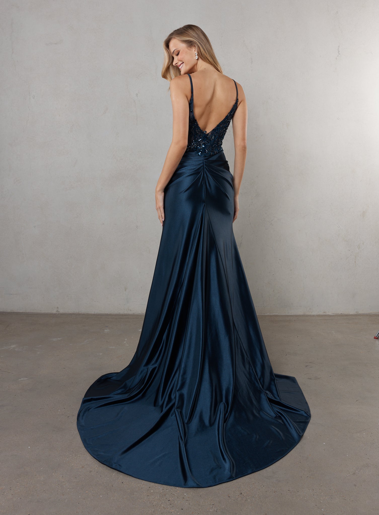 A V-neckline at both the front and back, paired with spaghetti straps and built-in bra cups, enhances the neckline with graceful allure. The gown’s gathered detailing across the front midsection and back flatters the figure, while the high-leg front split adds a daring, elegant touch.