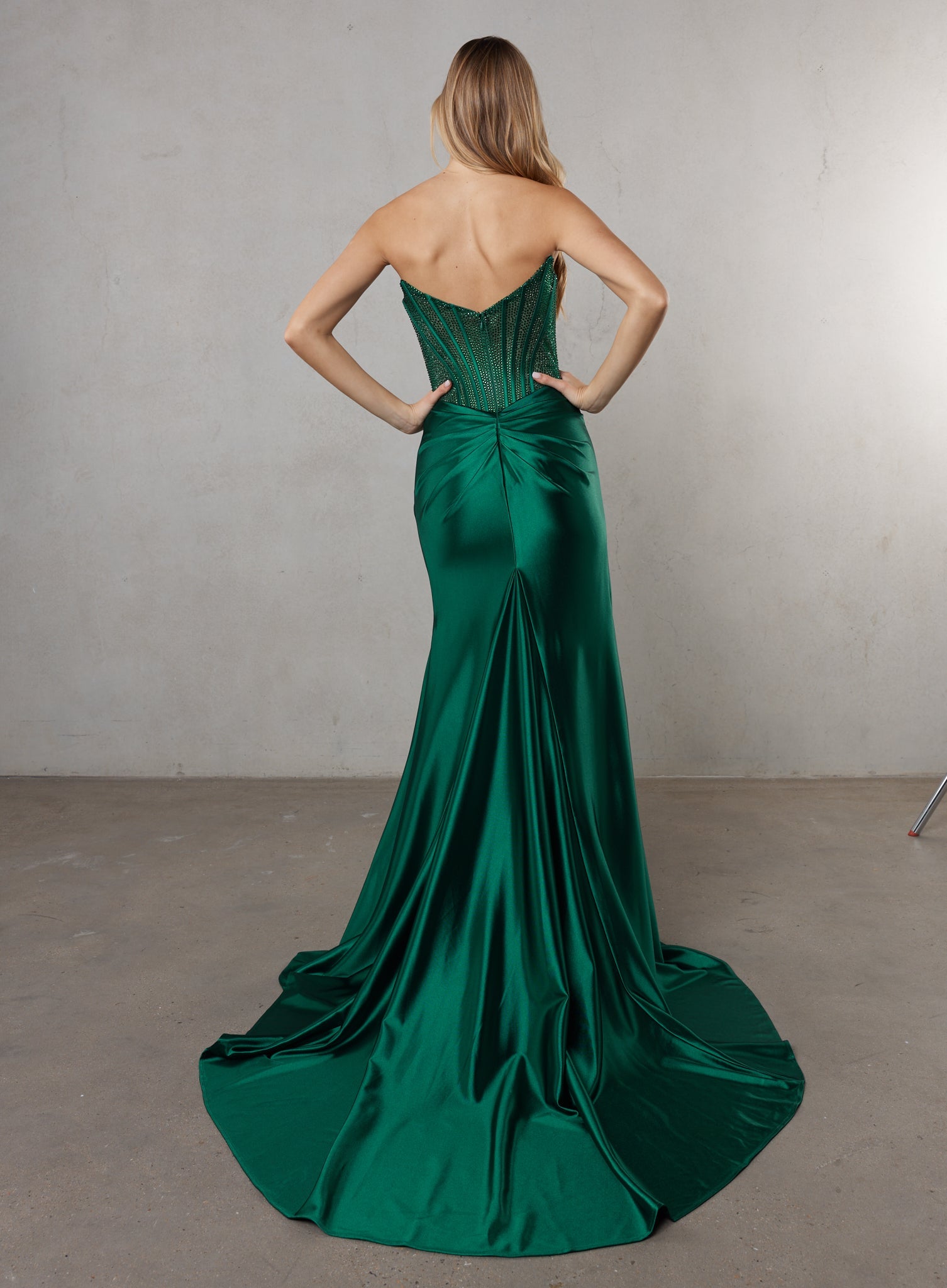 A strapless neckline with built-in bra cups enhances both support and allure, creating a flattering, feminine silhouette. The A-line skirt falls beautifully with soft pleats and a high-leg front split, offering effortless movement and modern elegance.