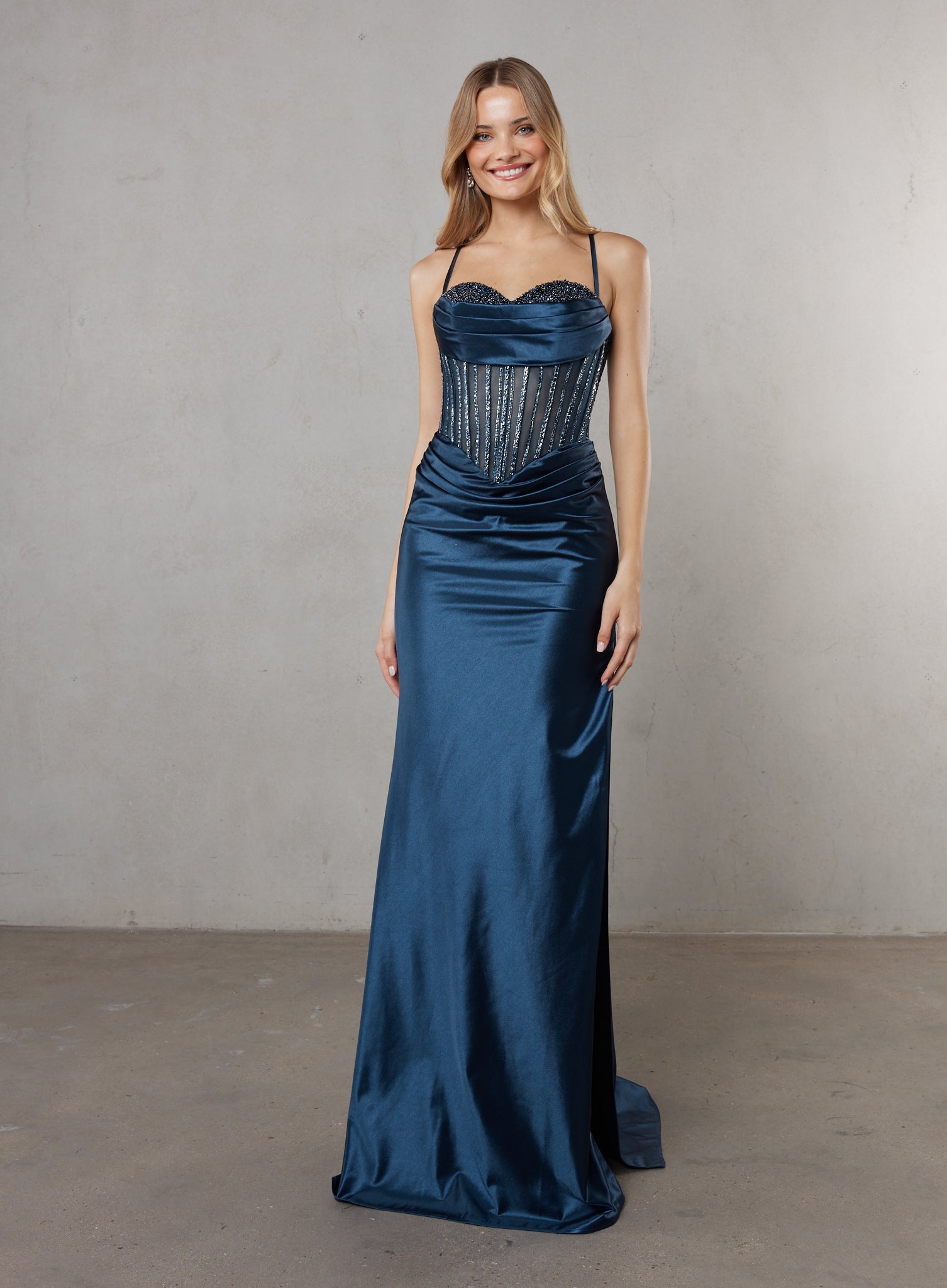 - Fitted silhouette showcasing illusion corset with beaded trim & built-in bra cups