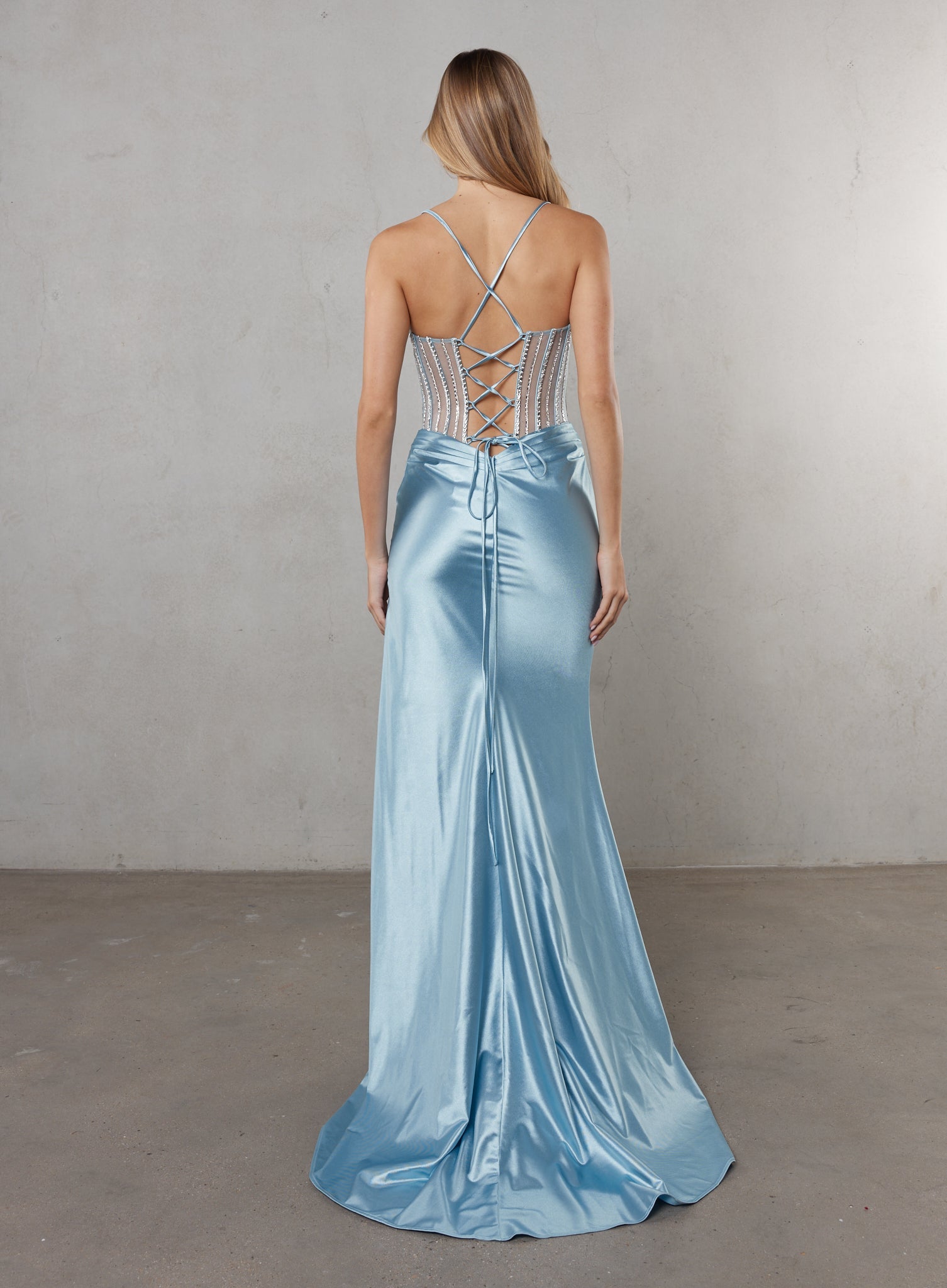 A sweetheart neckline with pleated drape detailing and delicate beading enhances the romantic appeal, while spaghetti straps that lace up at the back add an alluring, adjustable finish. The draped midsection folds into a soft V-shape, subtly defining the waist and creating a flattering silhouette. A side high-leg split completes the look with modern sophistication and graceful movement.