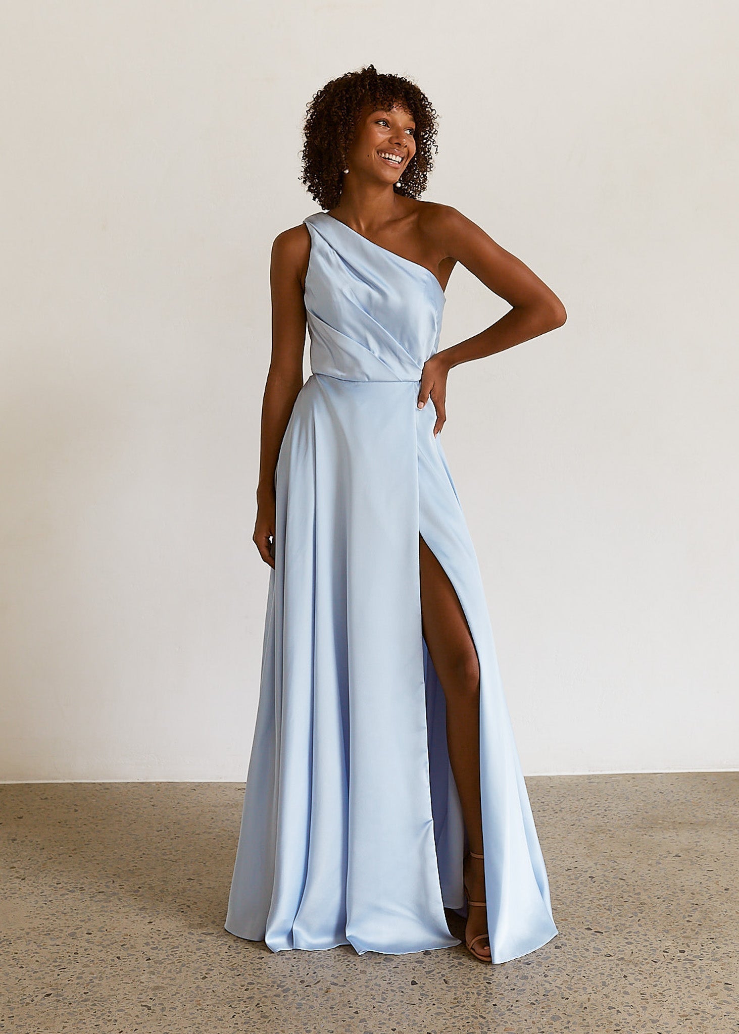 Introducing our latest must-have for your bridal party: the Mahonia Bridesmaid Dress. Crafted from divine Light Satin, it comes in an array of mesmerizing hues from Pale Blue to Midnight, and everything in between. The one-shoulder neckline with pin-tuck bodice creates a flattering silhouette. With built-in bra cups, so your bridesmaids feel supported and stunning all night long. The floor-length A-line skirt has cross-over side split detail, which allows the freedom to dance the night away!