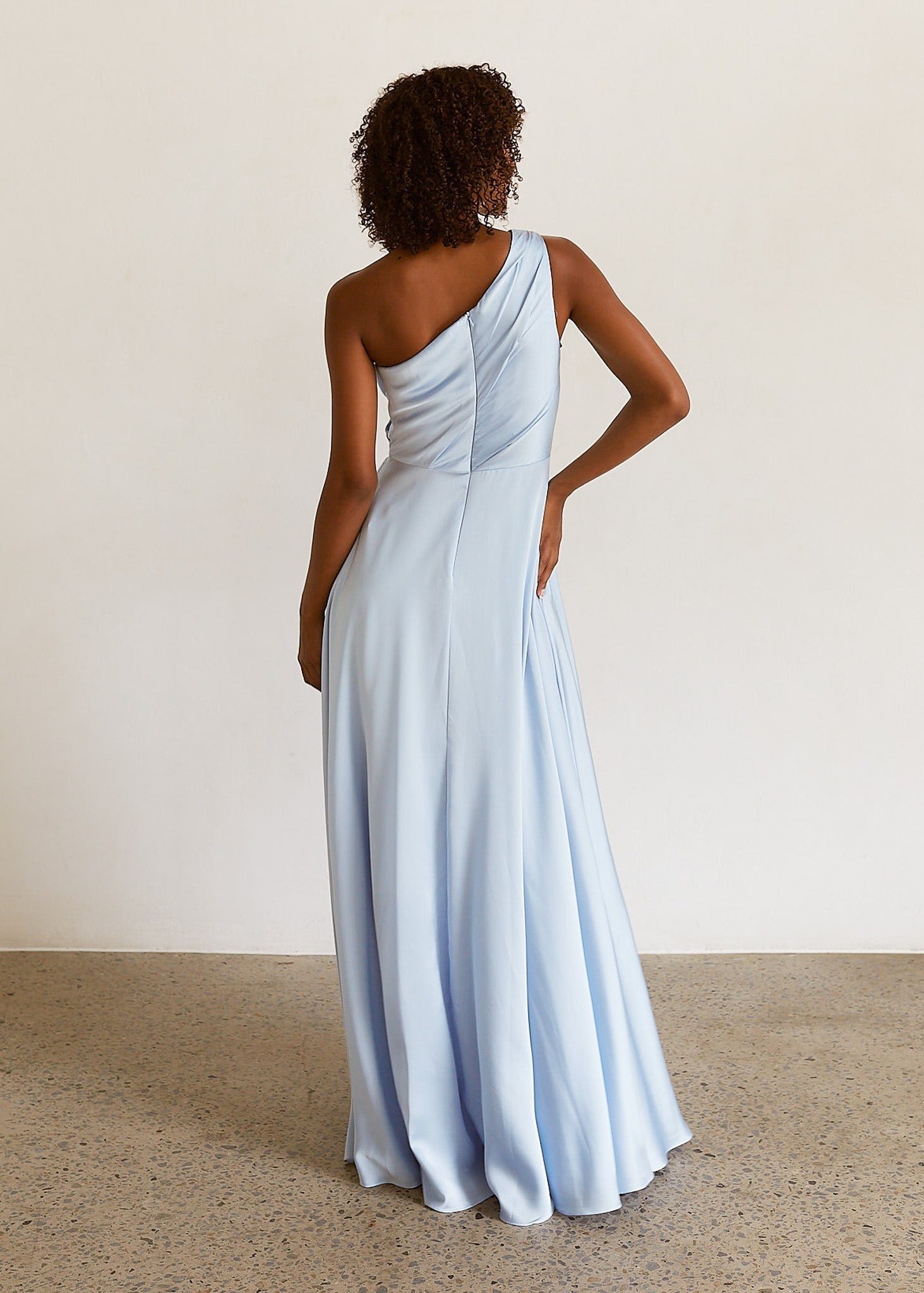 Introducing our latest must-have for your bridal party: the Mahonia Bridesmaid Dress. Crafted from divine Light Satin, it comes in an array of mesmerizing hues from Pale Blue to Midnight, and everything in between. The one-shoulder neckline with pin-tuck bodice creates a flattering silhouette. With built-in bra cups, so your bridesmaids feel supported and stunning all night long. The floor-length A-line skirt has cross-over side split detail, which allows the freedom to dance the night away!