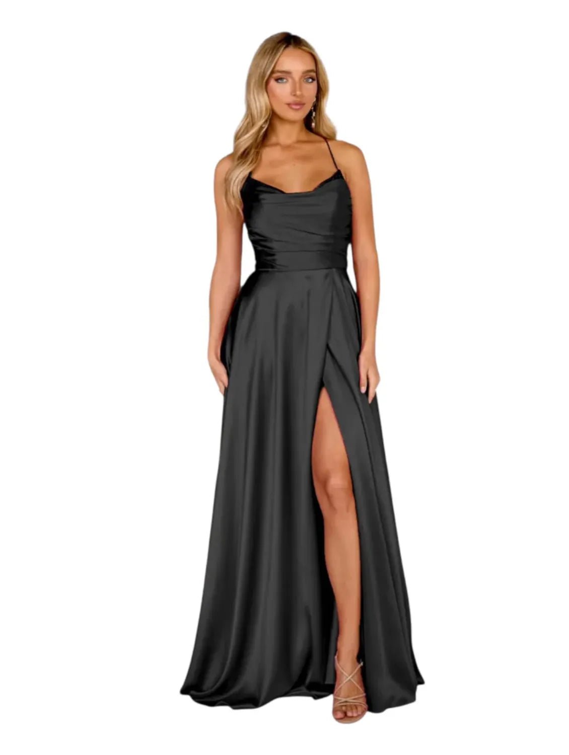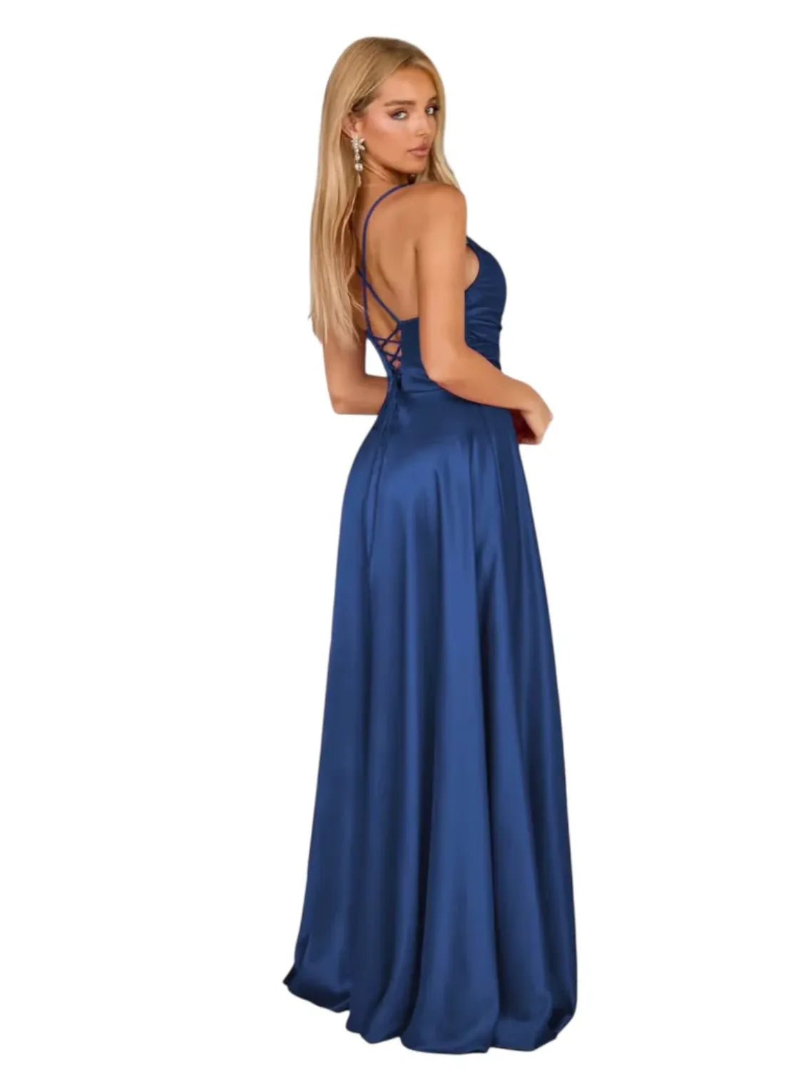 The draped satin bodice adds a luxurious touch, while the open V back with a lace-up closure ensures an adjustable and comfortable fit. The full A-line skirt flows gracefully, enhanced by an overlapping side skirt split for added movement. Fully lined with inner bra cups for support, the Mindy dress is finished with a back invisible zipper, making it an ideal choice for any formal event.