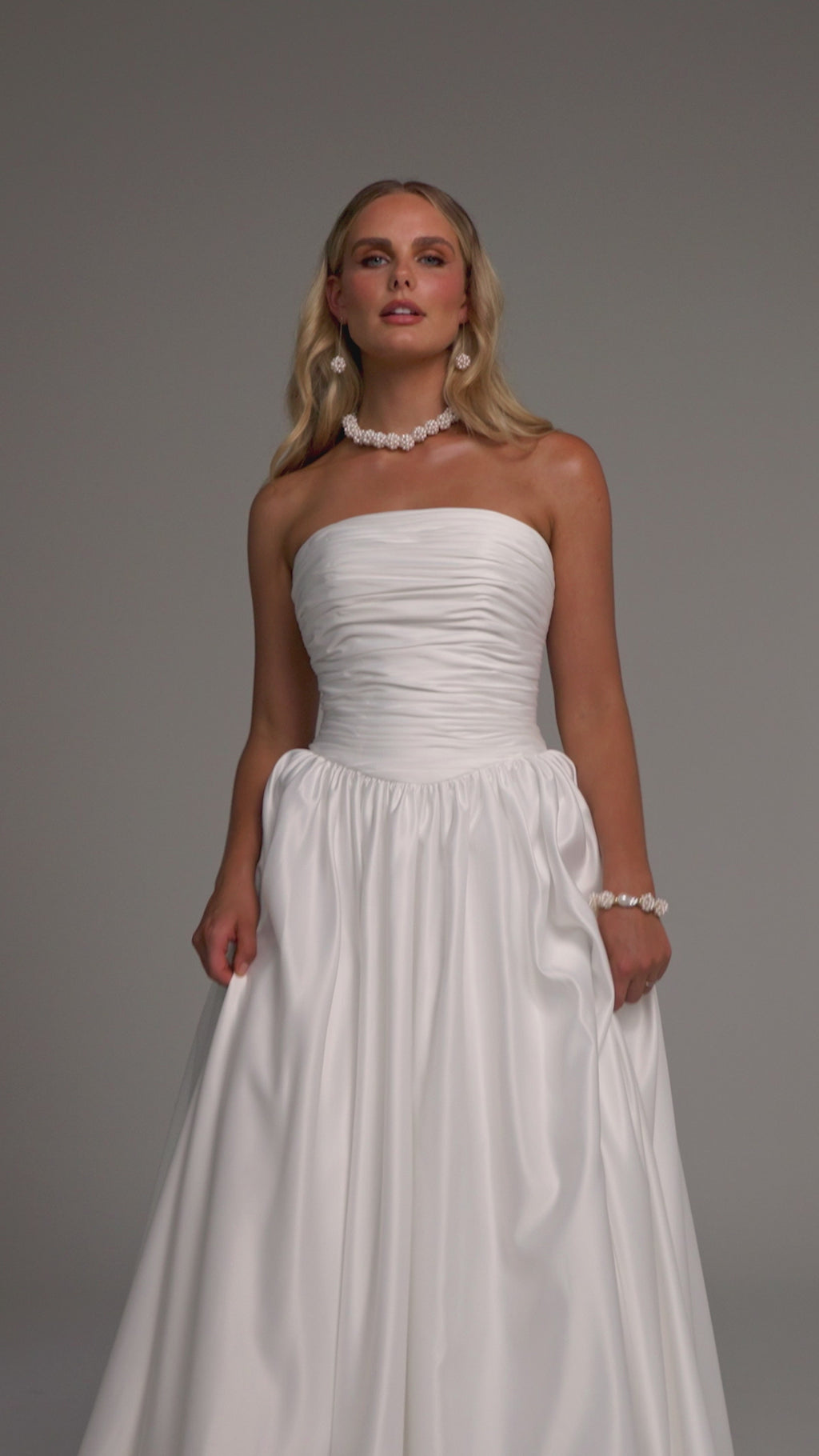 Timeless elegance meets modern romance in our Octavia wedding dress by Tania Olsen Designs, thoughtfully designed for the bride who values classic beauty with elevated detail. Crafted from luxurious satin, the strapless bodice features built-in nude bra cups for comfort and support, with soft ruching across the front and back that flatters the figure and adds graceful texture.