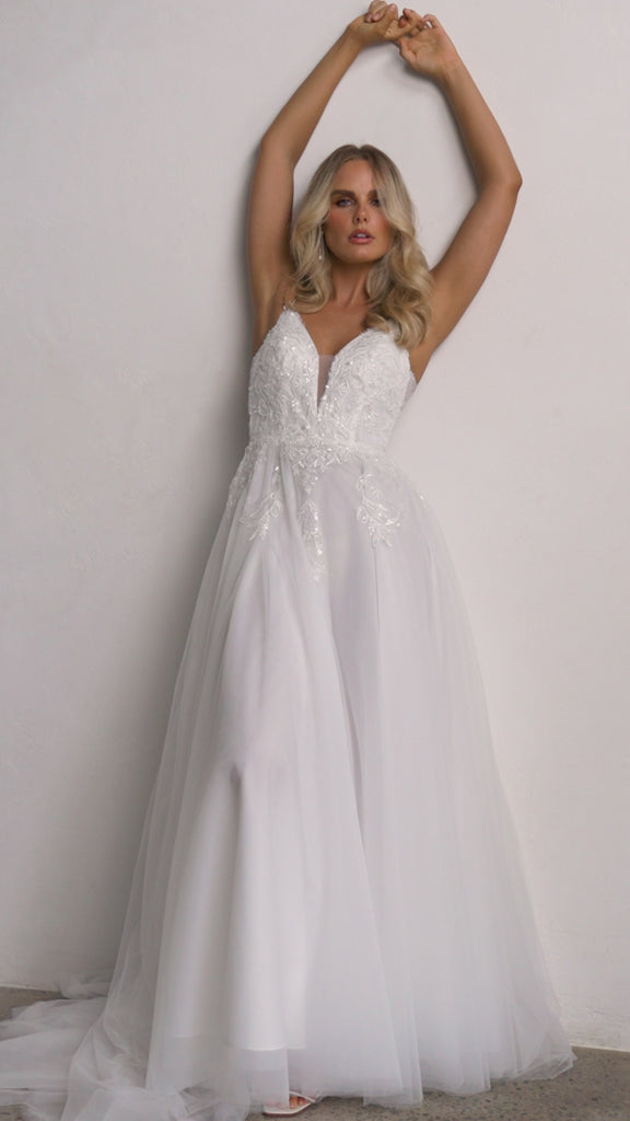 Falling into a voluminous, full A-line skirt, the gown flows into a sweeping chapel-length train that trails behind with effortless grace. Finished with an invisible zip for a seamless silhouette.
