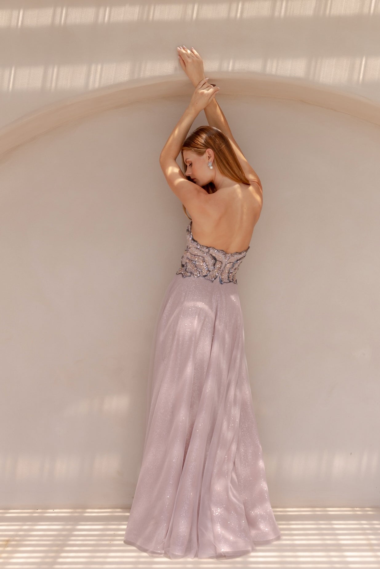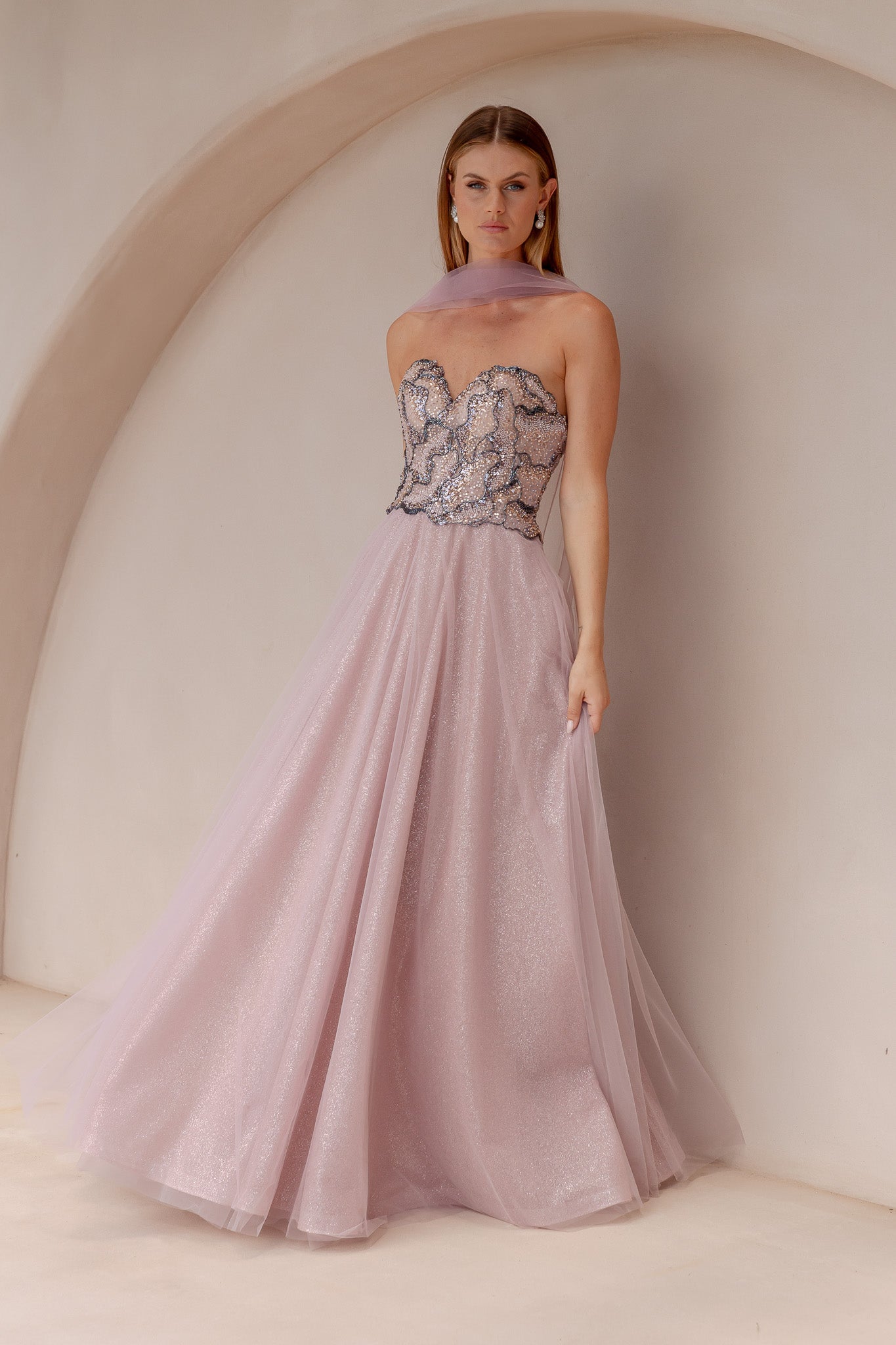 Turn heads in our dazzling Zarle Formal Dress, crafted from luxurious beaded tulle. The intricately beaded bodice adds a touch of glamour, while the voluminous A-line skirt in sparkling tulle creates a fairy tale silhouette. Complete with a delicate tulle scarf  to drape elegantly around the neck and an invisible back zip for a seamless finish, this gown is perfect for formal events, evening occasions, or special celebrations.