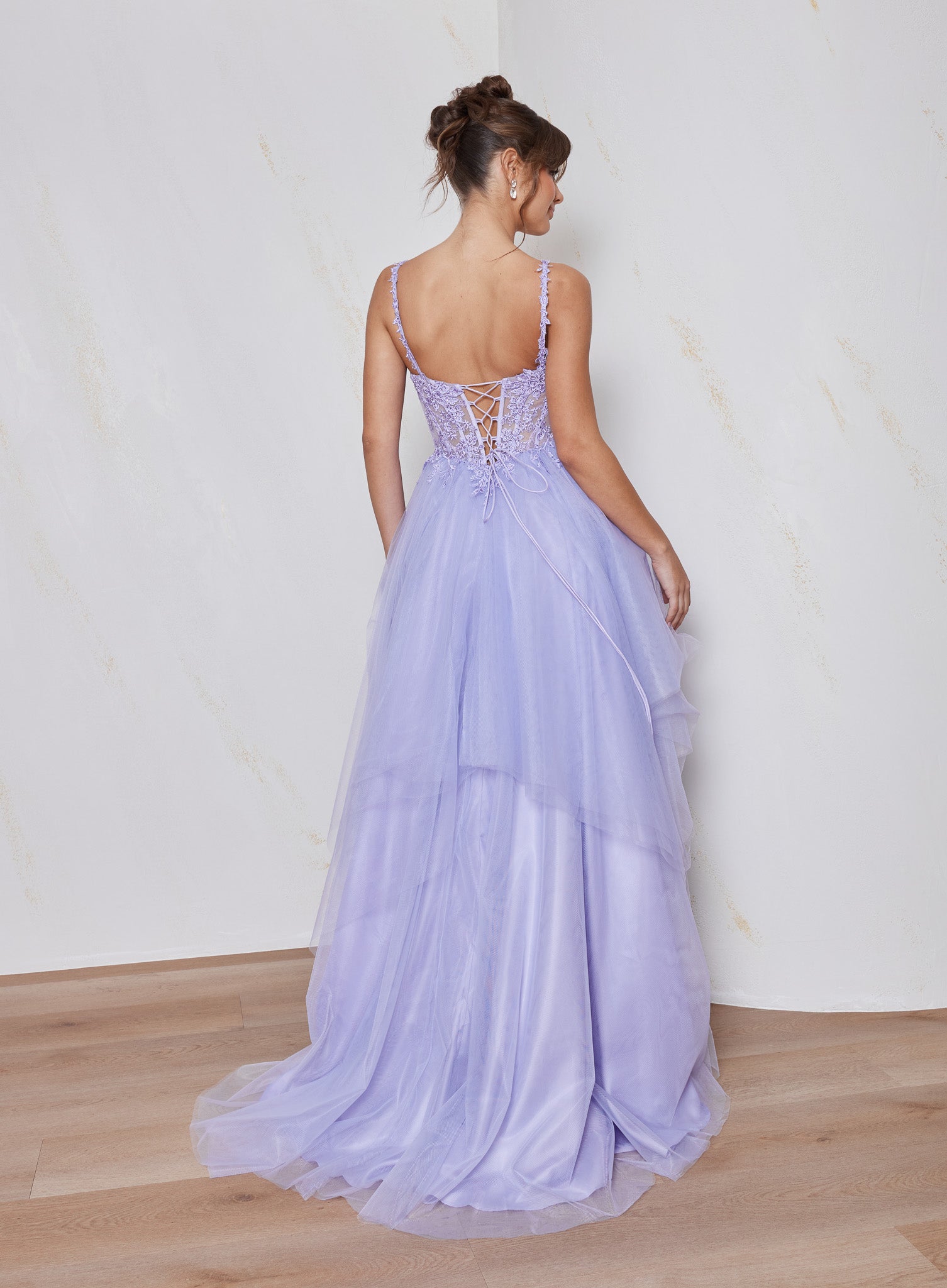 Delicate rhinestone lace appliqué adorns the bodice and gently cascades into the skirt at the slightly dipped basque waist, blending sparkle and softness seamlessly. The Caitlin Formal Dress is the perfect combination of intricate detail and ethereal movement.