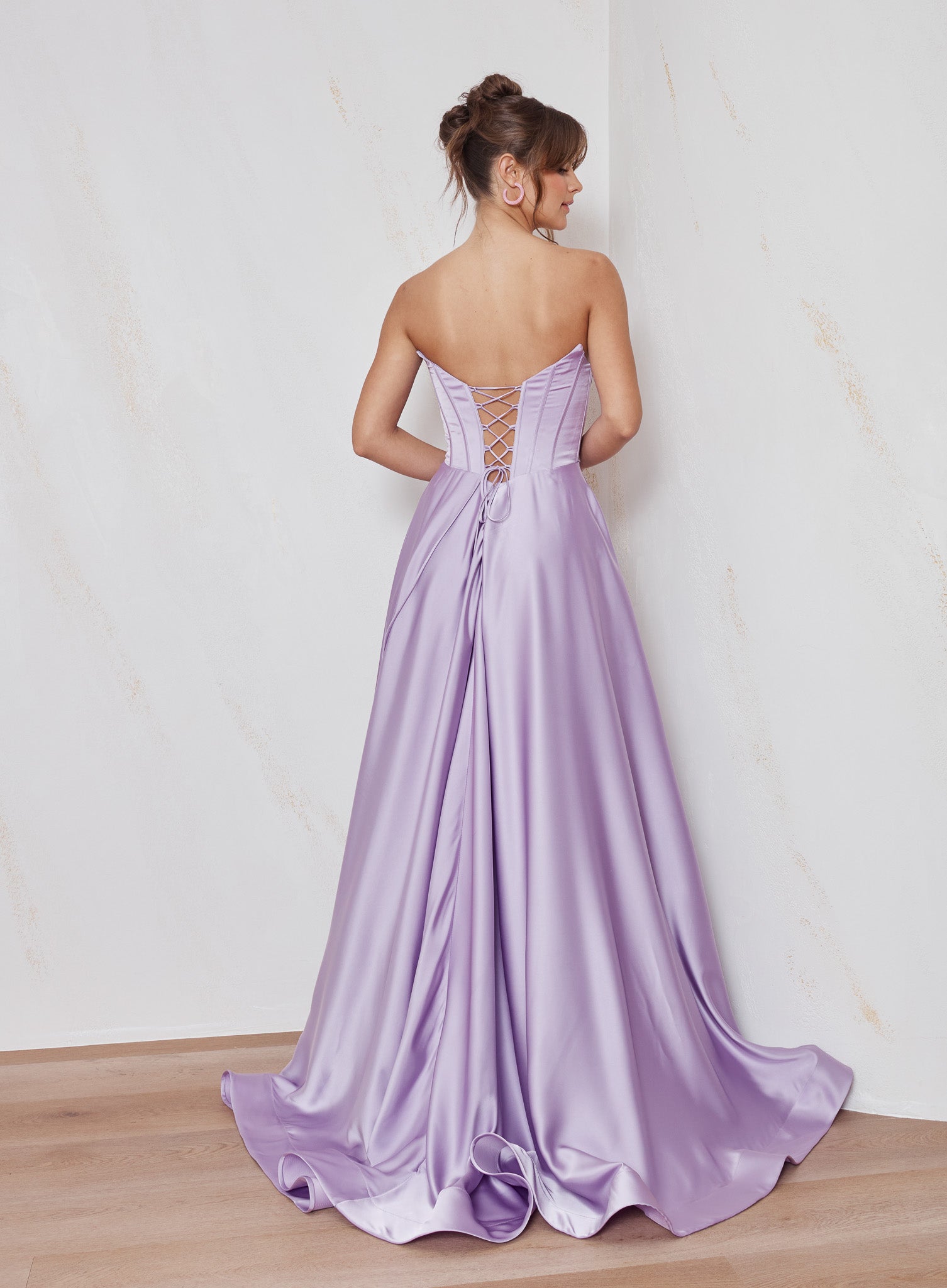 The strapless sweetheart neckline creates a classic, feminine look, while the lace-up back allows for an adjustable and secure fit. Crafted from luxurious satin, the Celine Formal Dress offers a refined and polished aesthetic suited for any formal occasion.