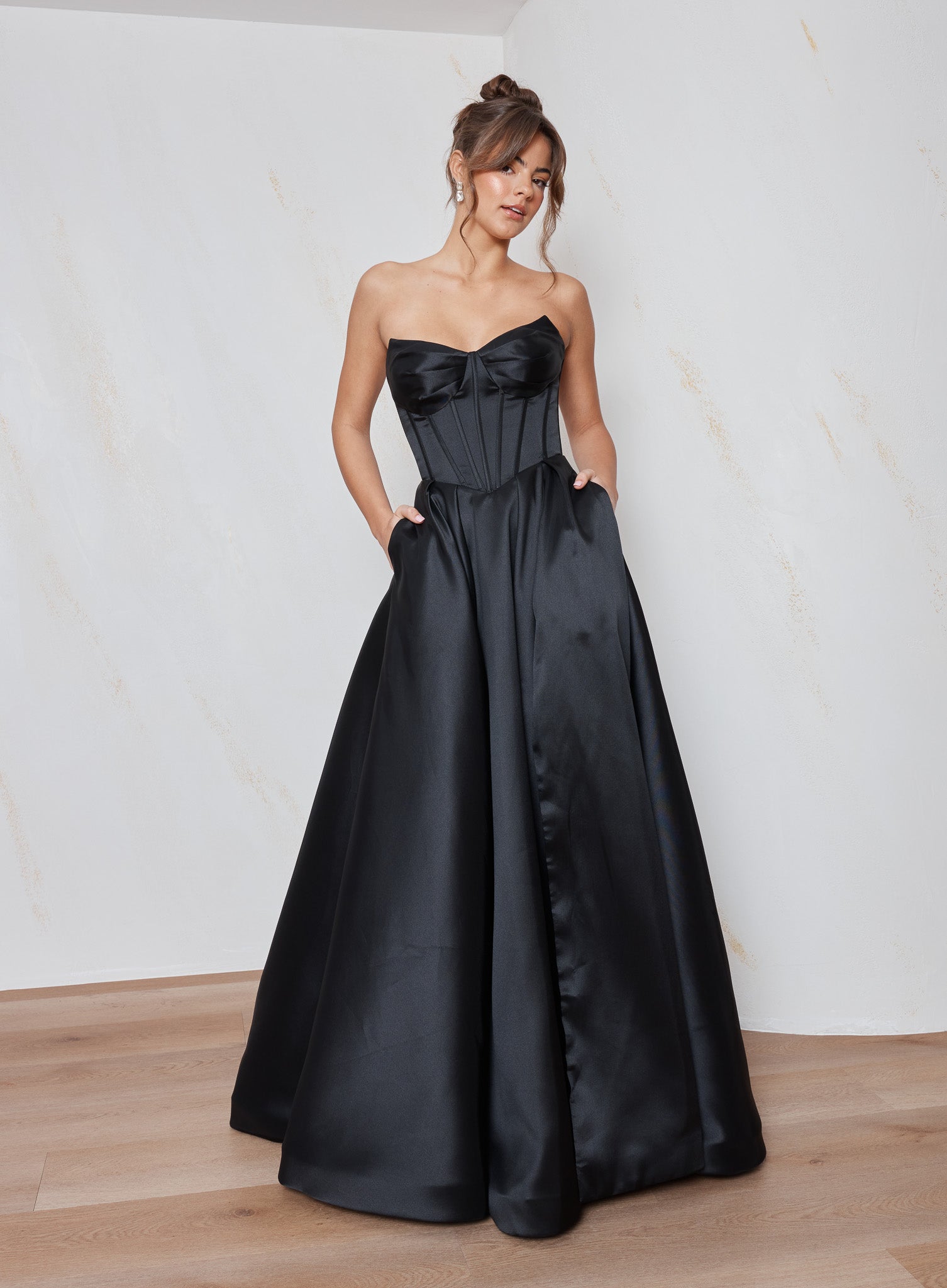 The back features a lace-up closure for an adjustable fit, paired with an invisible zipper into the skirt for a seamless look. The Della Formal Dress perfectly balances structure, elegance, and sophistication—ideal for a statement formal occasion.