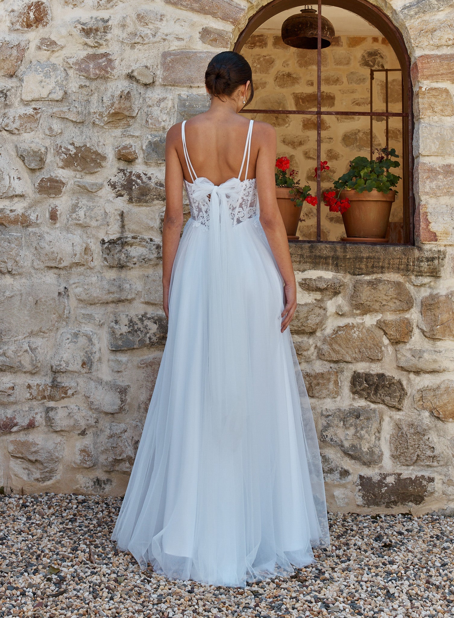 At the back, a tulle bow ties across the bodice, adding a soft, feminine finish. Crafted from lace appliqué and tulle, the Daisie Debutante Dress embodies refined detail and graceful movement.