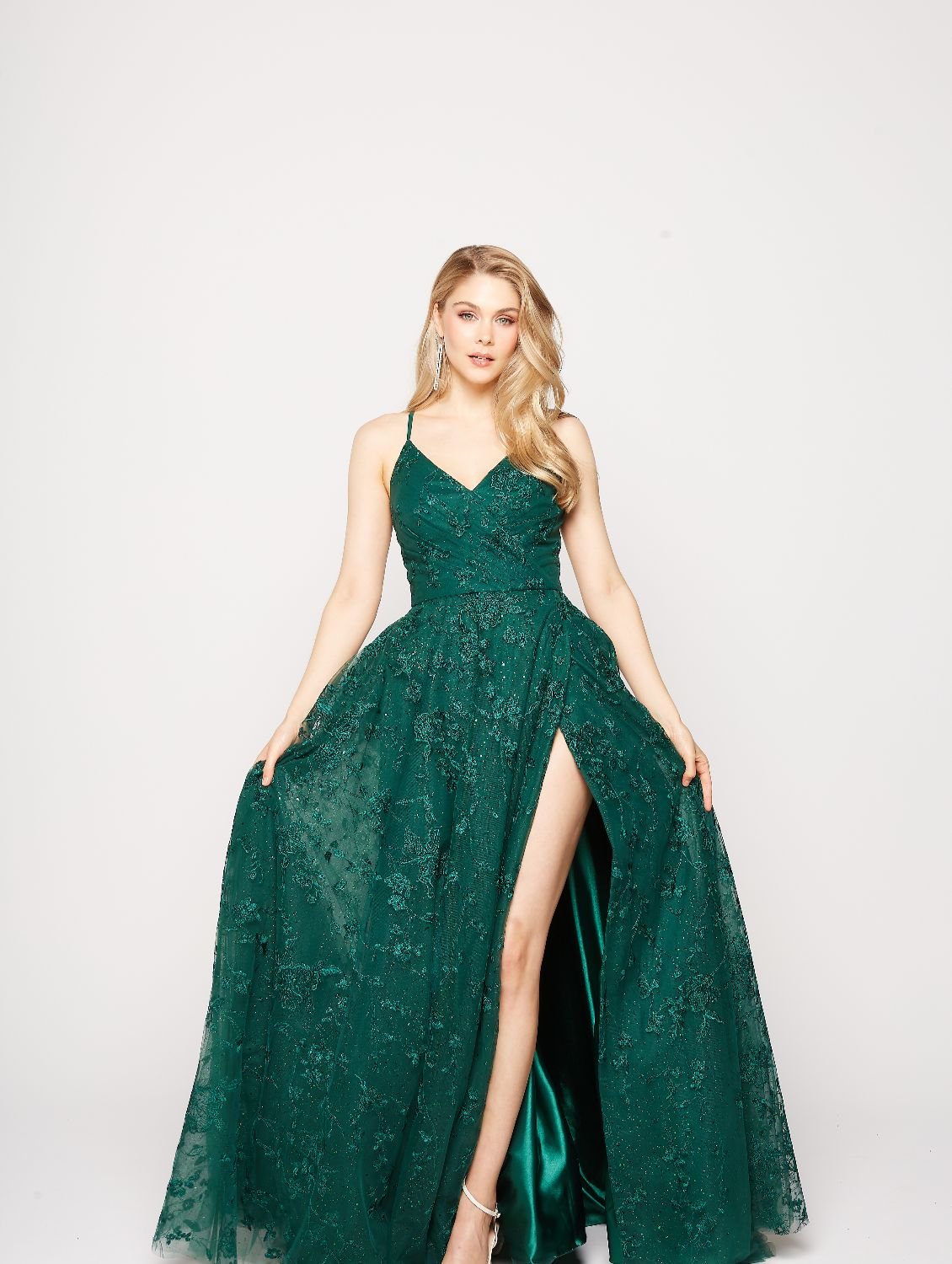 The Briony PO972 A-Line Floral Tulle Formal Dress by Tania Olsen Designs features a structured wrap style bodice with v-neckline, spaghetti straps and a crossover strappy back. From the waistline falls an A-Line floor length skirt with a subtle overlapping leg split. The Briony is available in sizes AU 2-30 in Pale Blue, Crimson, Emerald and Vintage White.