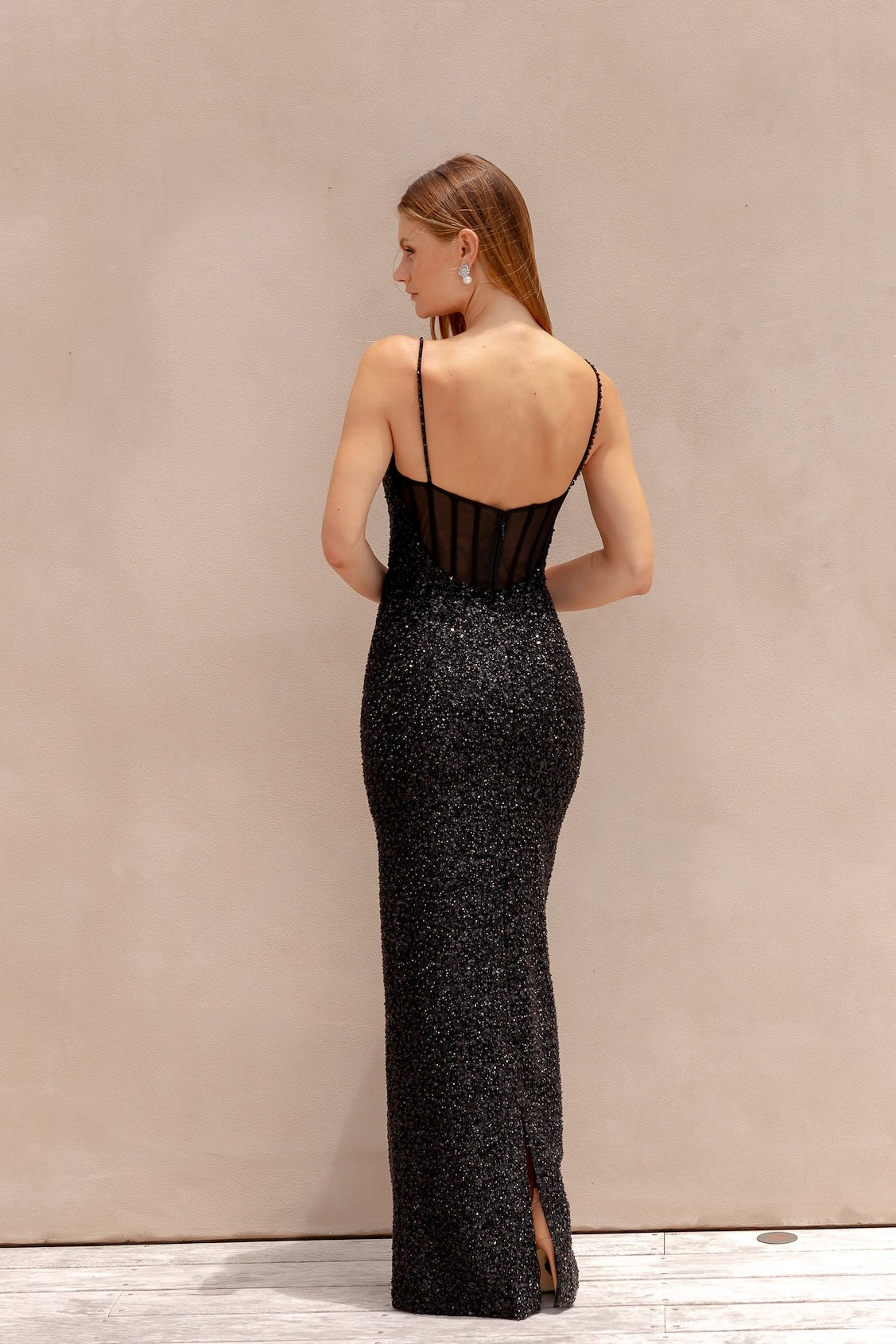 Shimmer with sophistication in our Livie Formal Dress, designed in a sleek fitted silhouette. The sweetheart neckline is complemented by delicate beaded spaghetti straps, while the illusion bodice at the back with structured boning offers both allure and support. A soft tulle scarf drapes elegantly around the neck for added romance, with a subtle back split allowing ease of movement. Finished with an invisible zip for a seamless fit, this gown is the perfect choice for evening occasions and formal events.