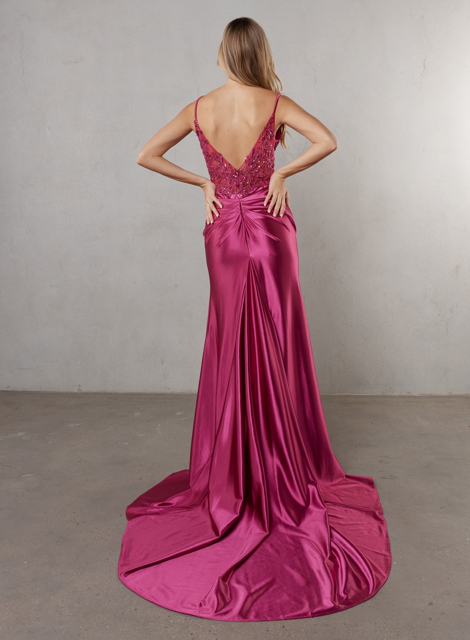 A V-neckline at both the front and back, paired with spaghetti straps and built-in bra cups, enhances the neckline with graceful allure. The gown’s gathered detailing across the front midsection and back flatters the figure, while the high-leg front split adds a daring, elegant touch.