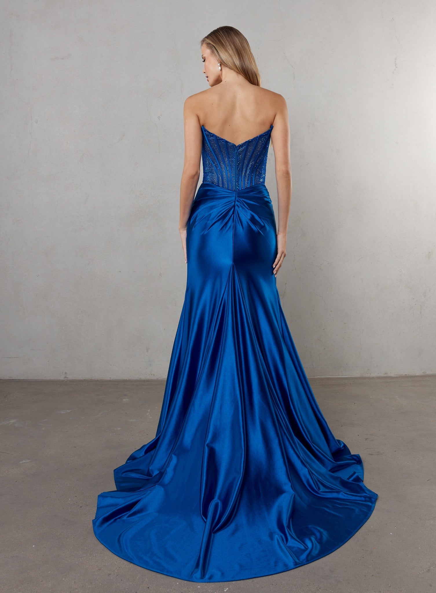A strapless neckline with built-in bra cups enhances both support and allure, creating a flattering, feminine silhouette. The A-line skirt falls beautifully with soft pleats and a high-leg front split, offering effortless movement and modern elegance.