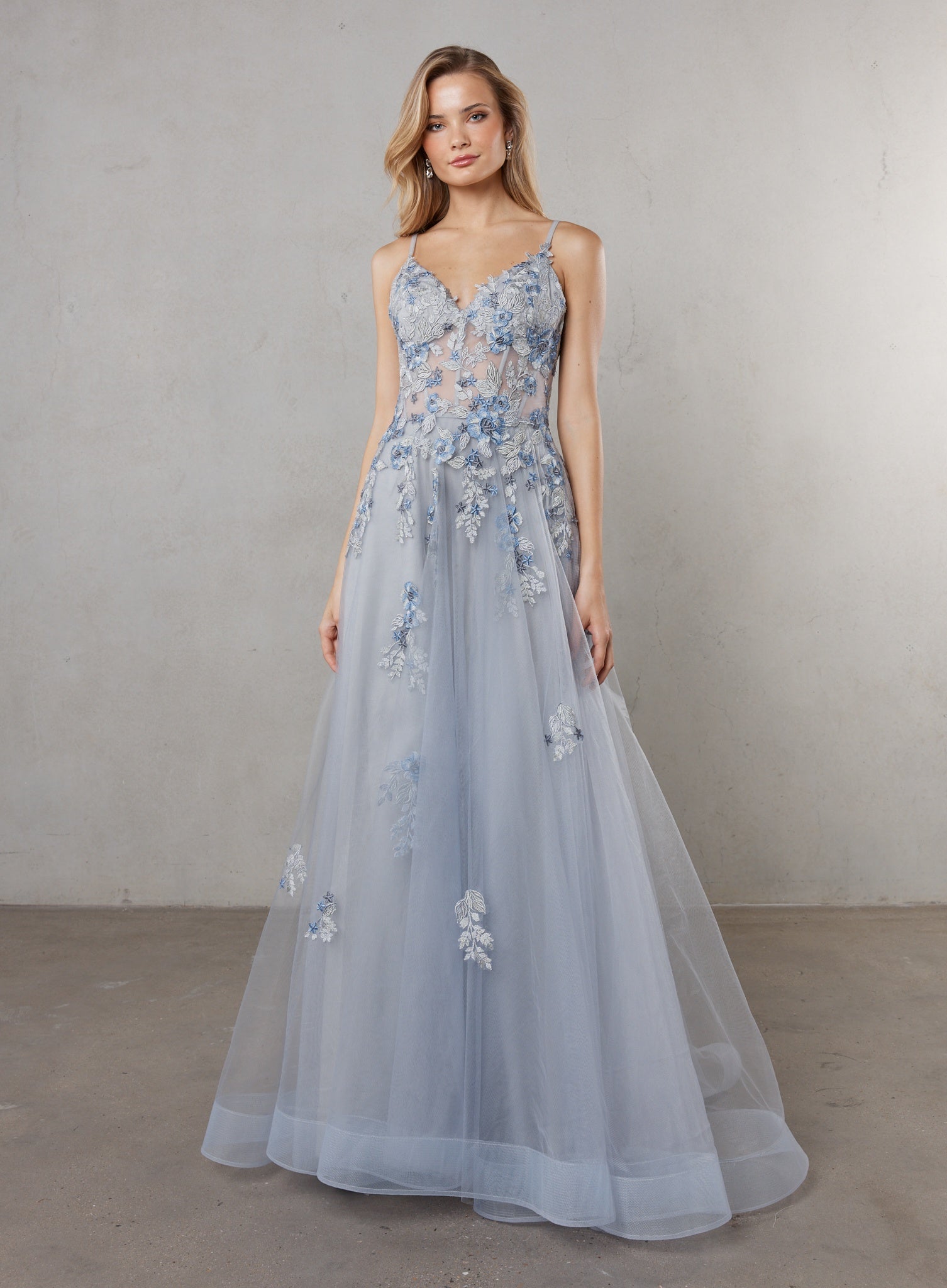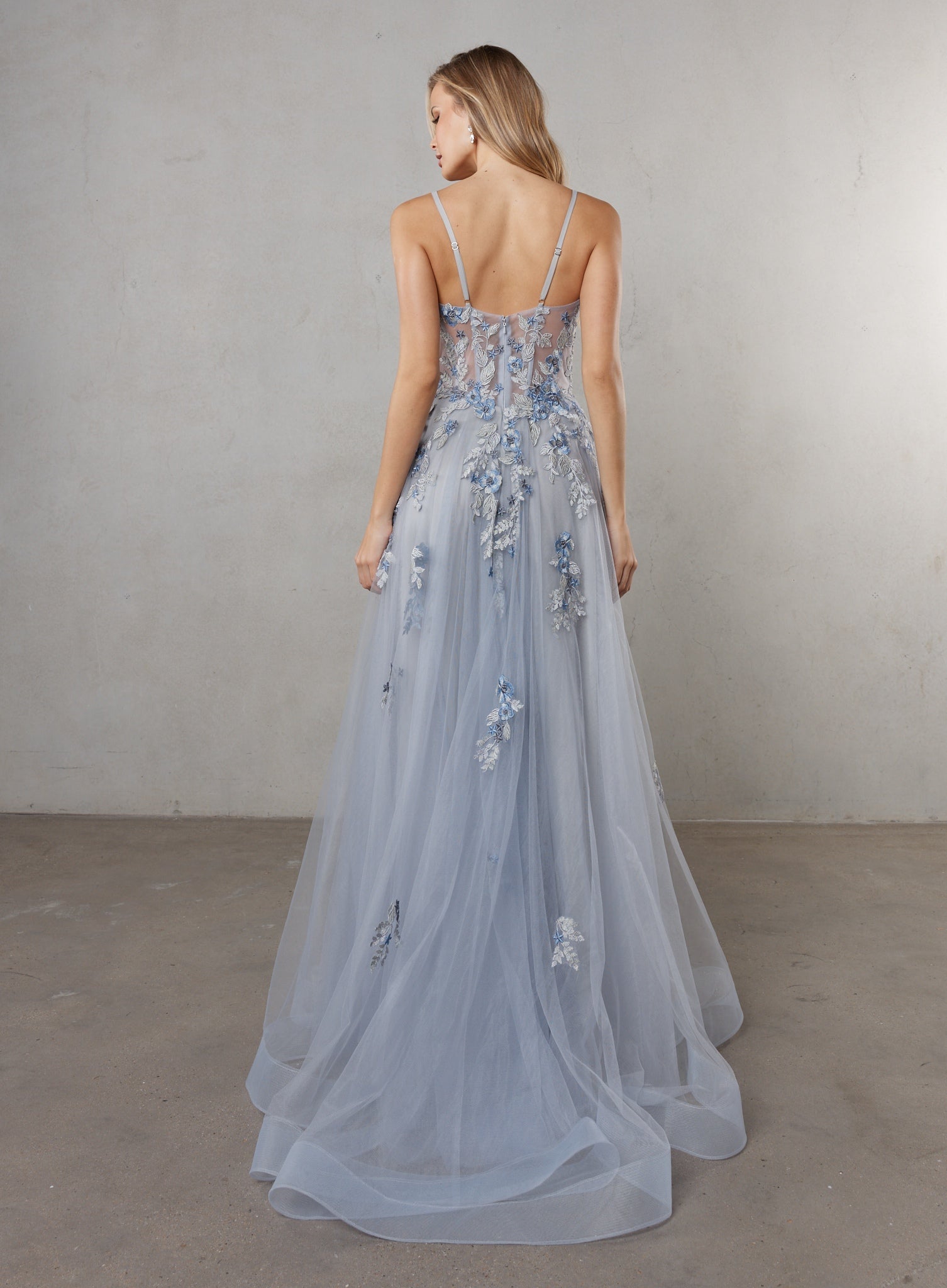 - Voluminous A-line skirt at floor length with tulle overlay