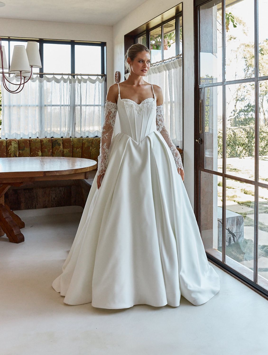 The Briar wedding dress features a scoop neckline bodice with peekaboo bust details, adorned with beaded lace appliqué. Structured with boning, the bodice finishes in a basque waistline that flows into a full pleated skirt. The cathedral-length train is accented with loop-and-button detailing that trails elegantly from top to hem. Delicate illusion lace detachable long sleeves complete the look with a touch of romance.