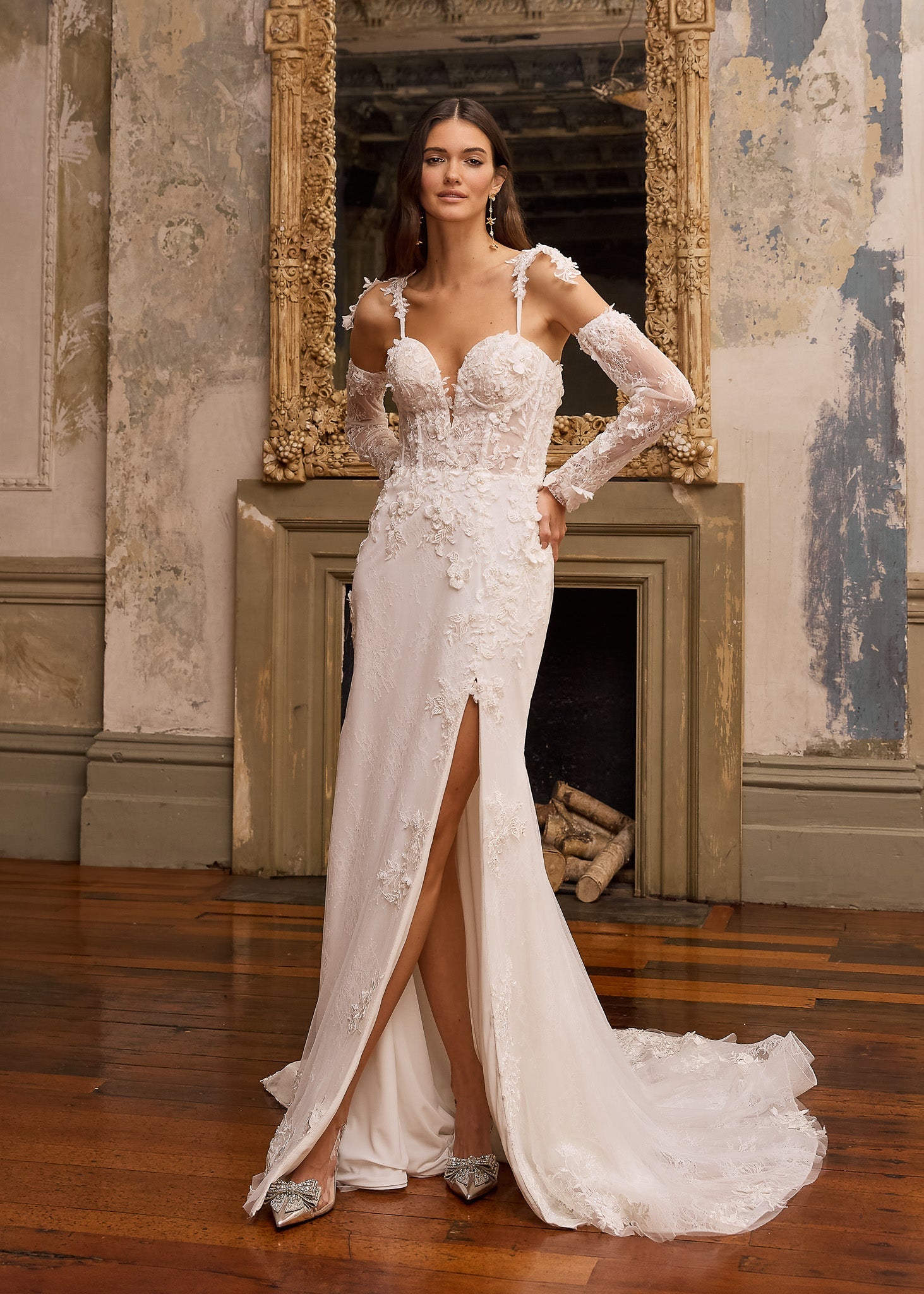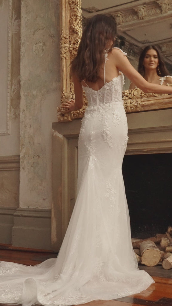 The Eira wedding dress is a piece of art with her modern silhouette and traditional embellishments. The Fit and flare wedding dress flaunts an illusion bodice with a deep sweetheart plunge neckline. The exposed boning is decorated in 3D lace applique that cascades down to the fitted skirt. Featuring a thigh split and intricate layers of tulle, chantilly lace and mindfully placed applique. Adorned with pearl beading and detachable straps and long sleeves you can make Eira your own.