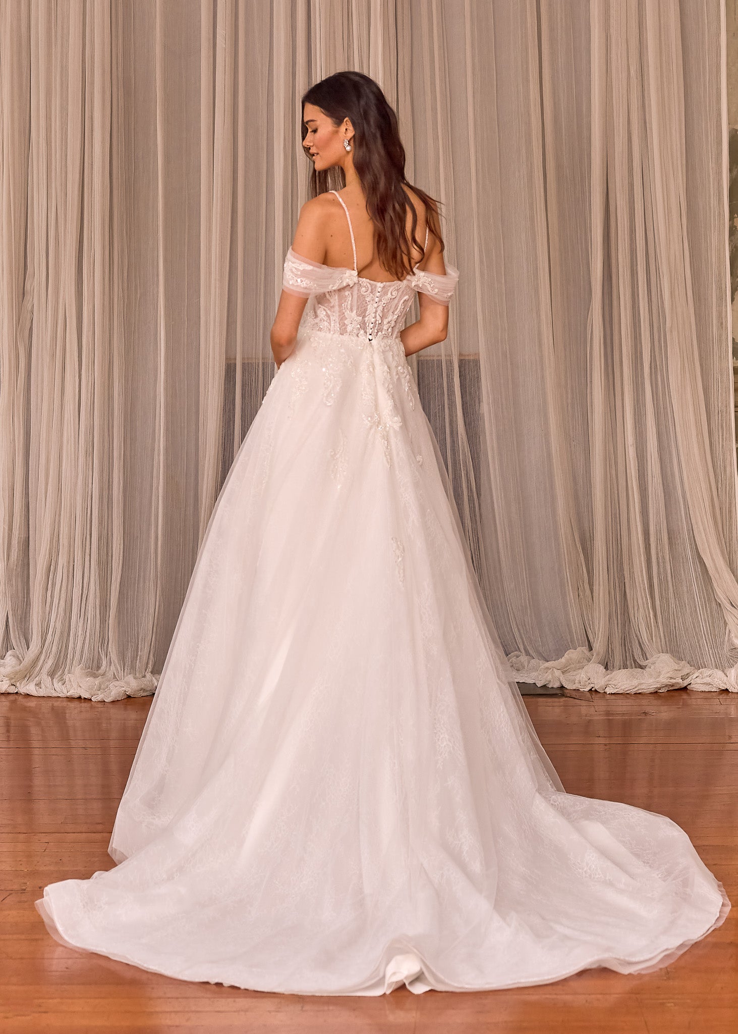 The Elina wedding dress is the modern princess gown. Featuring a sweetheart balconet corset with an illusion soft lace boned base. Adorned with beading and lace applique. The thin beaded spaghetti straps offer support with detachable off the shoulder straps for extra charm. Lace applique cascades down the A-line skirt with a dreamy chapel length train.