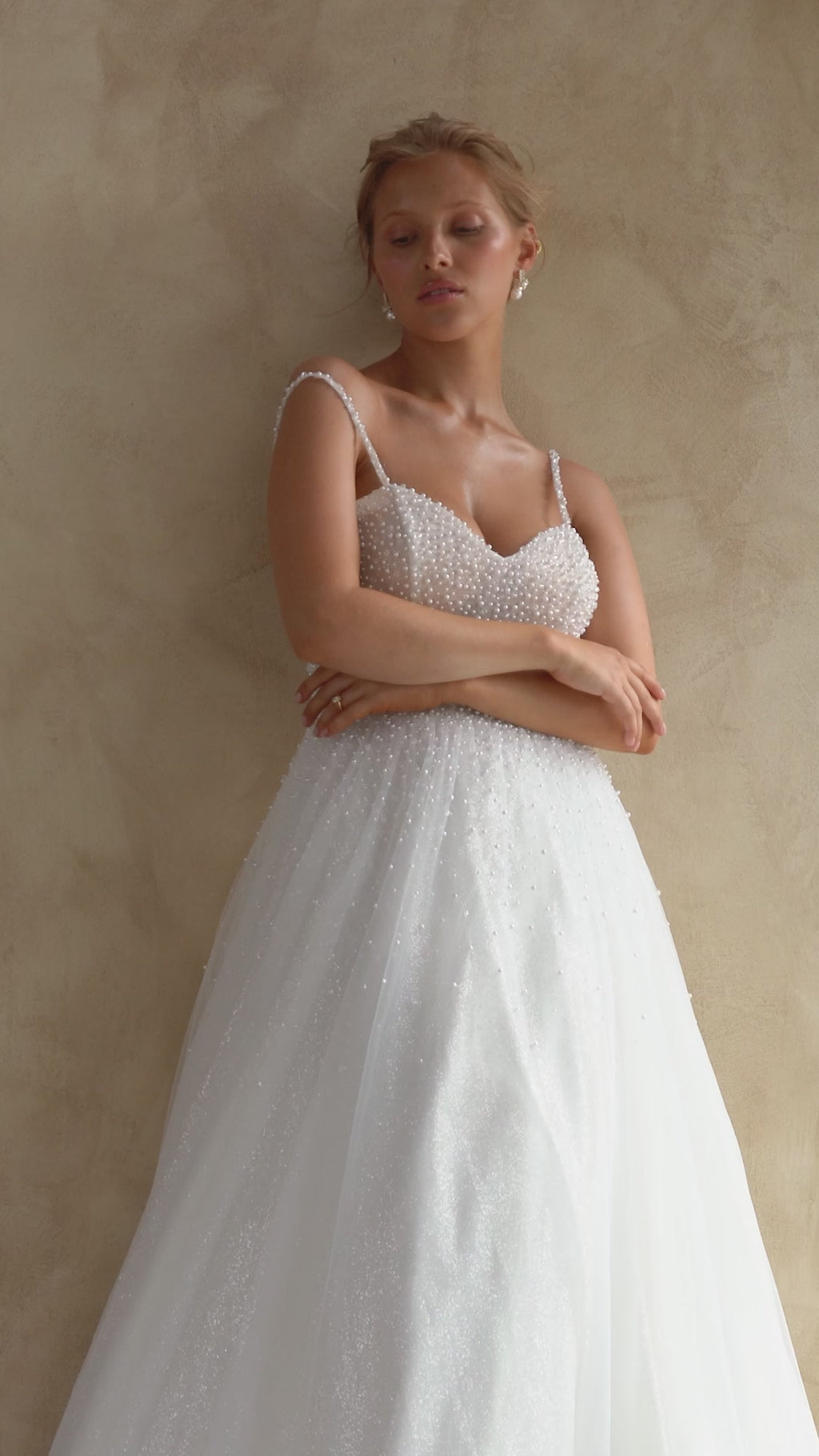 The Enya wedding dress is for the romantics. Her dazzling bodice features a sweetheart neckline, exposed boning and spaghetti straps. Covered in decadent pearls and crystals. The voluminous skirt features layers of sparkle and plain tulle finishing in a chapel length train.