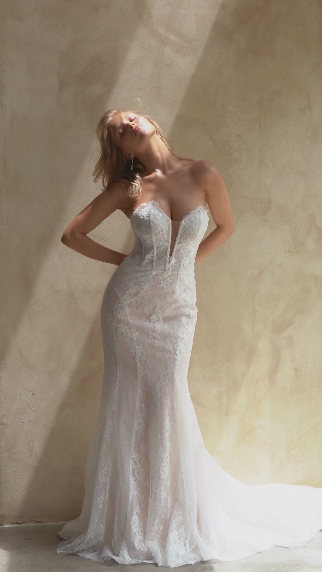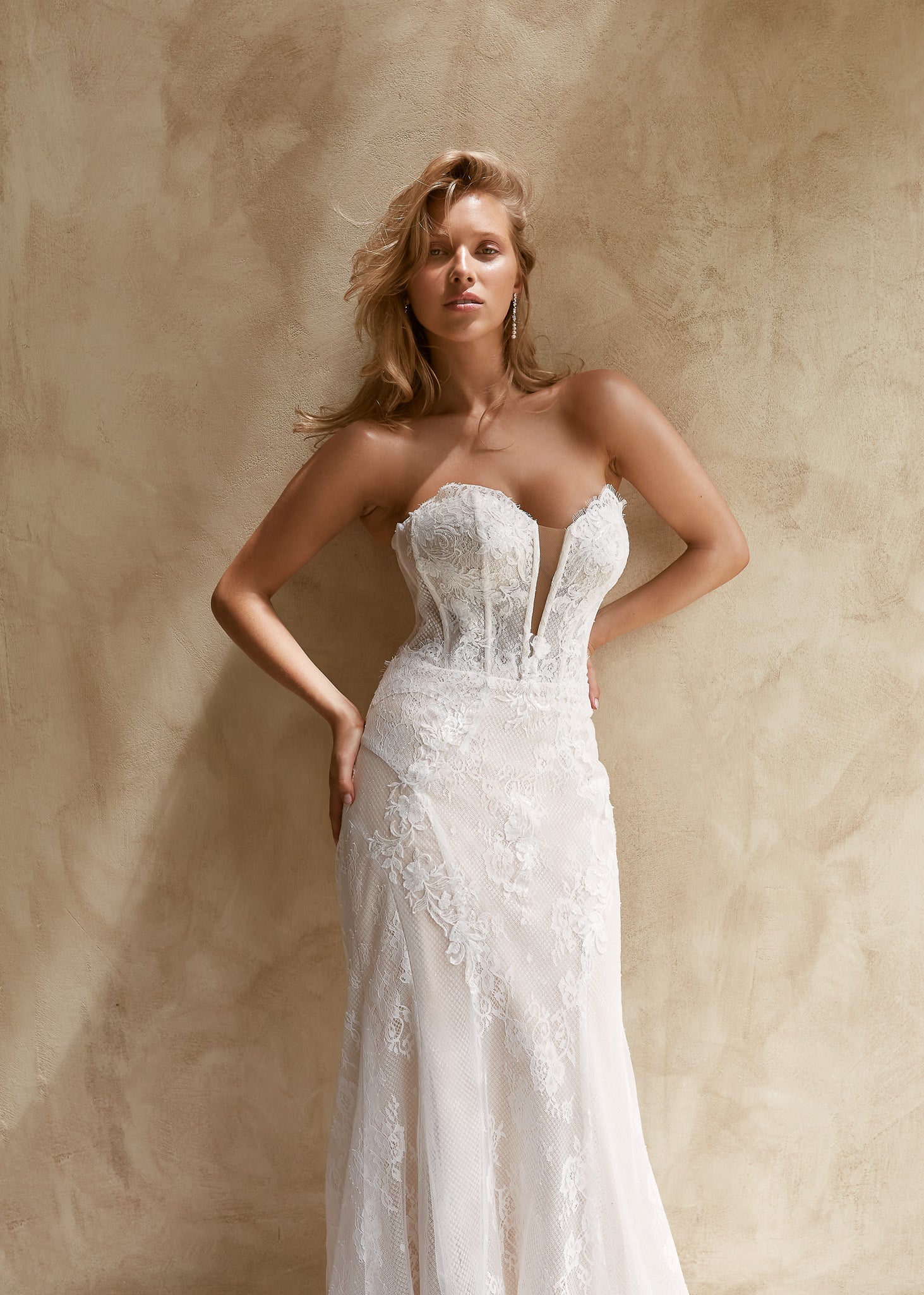 The Inara wedding dress is for the bride looking for a modern dress with traditional flare. Inara features a strapless sweetheart bustier with a deep v neck and mesh panel. The bodice is finished with delicate scalloped lace. A harmonious texture is created with layers of sparkle tulle, plain tulle, soft lace and lace applique. The mermaid silhouette features flattering panels to accentuate your figure, finishing in a back skirt train.
