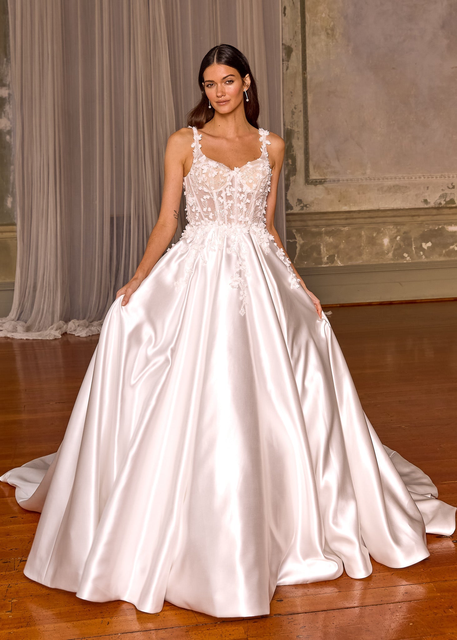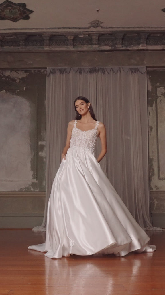 The Iris wedding dress is simply iridescent with the combined textures of the illusion botanical bodice and luminescent satin skirt. The exposed boned corset bodice features a soft sweetheart neckline with narrow shoulder straps. Adorned with 3D botanical lace and crystal beading which cascades through to the hipline of the princess satin skirt. Featuring front and back inverted pleats for ethereal dimension, a dramatic cathedral train and a full layered petticoat for volume.
