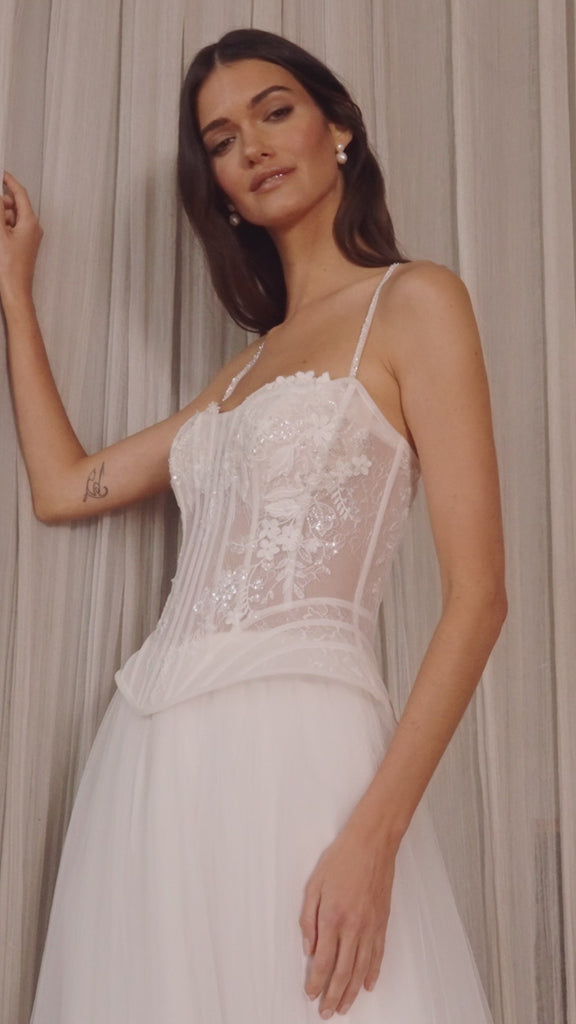 The Liora wedding dress is one for the modern romantics. She is made up of two pieces with a flattering exposed boning corset featuring intricate boning designs, illusion panels, and delicate lace applique placement. Worn over her gathered tulle A-line skirt which cascades into a cathedral length train.