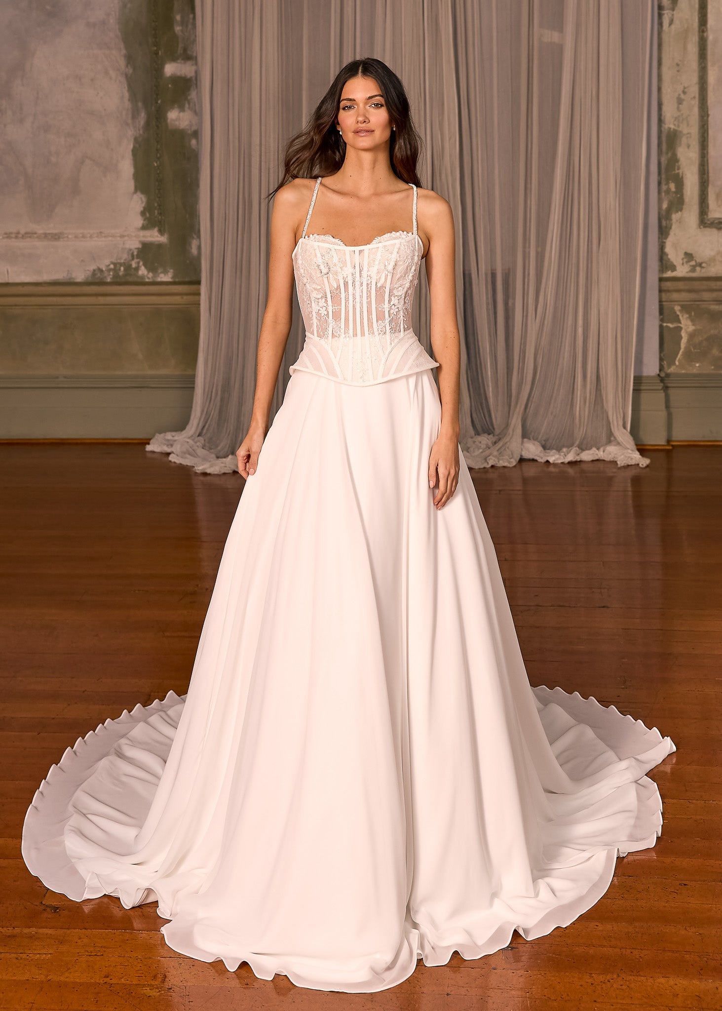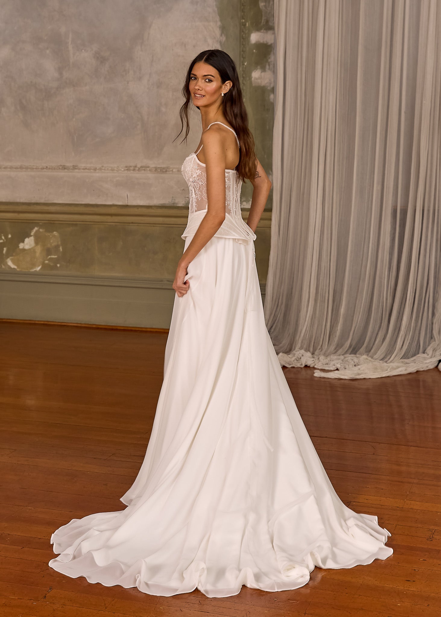 The Liora wedding dress is one for the modern romantics. She is made up of two pieces with a flattering exposed boning corset featuring intricate boning designs, illusion panels, and delicate lace applique placement. Worn over her gathered georgette A-line skirt which cascades into a cathedral length train.