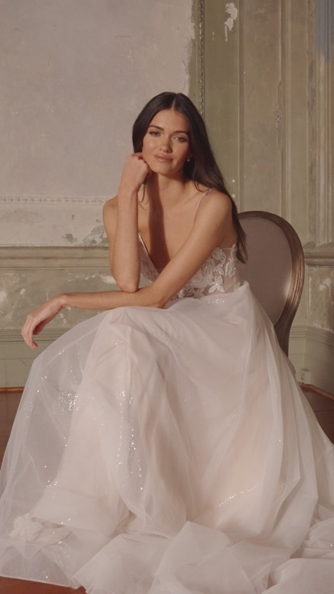 The Livia wedding dress is for the romantics. Her flattering bodice features a rounded v neckline with delicate spaghetti straps. The illusion bodice features a cascade or regal lace applique from the bust to a sheer base. Finished with a detachable beaded belt with a back bow detail. The A-line skirt features layers of plain and glitter tulle with an illusion chapel train and crinoline hem.