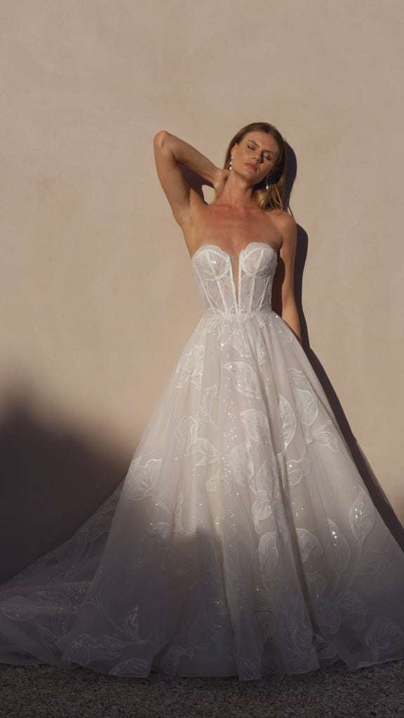 This gown is the perfect harmony of classic bridal romance and contemporary detail—ideal for the modern bride seeking timeless beauty.
