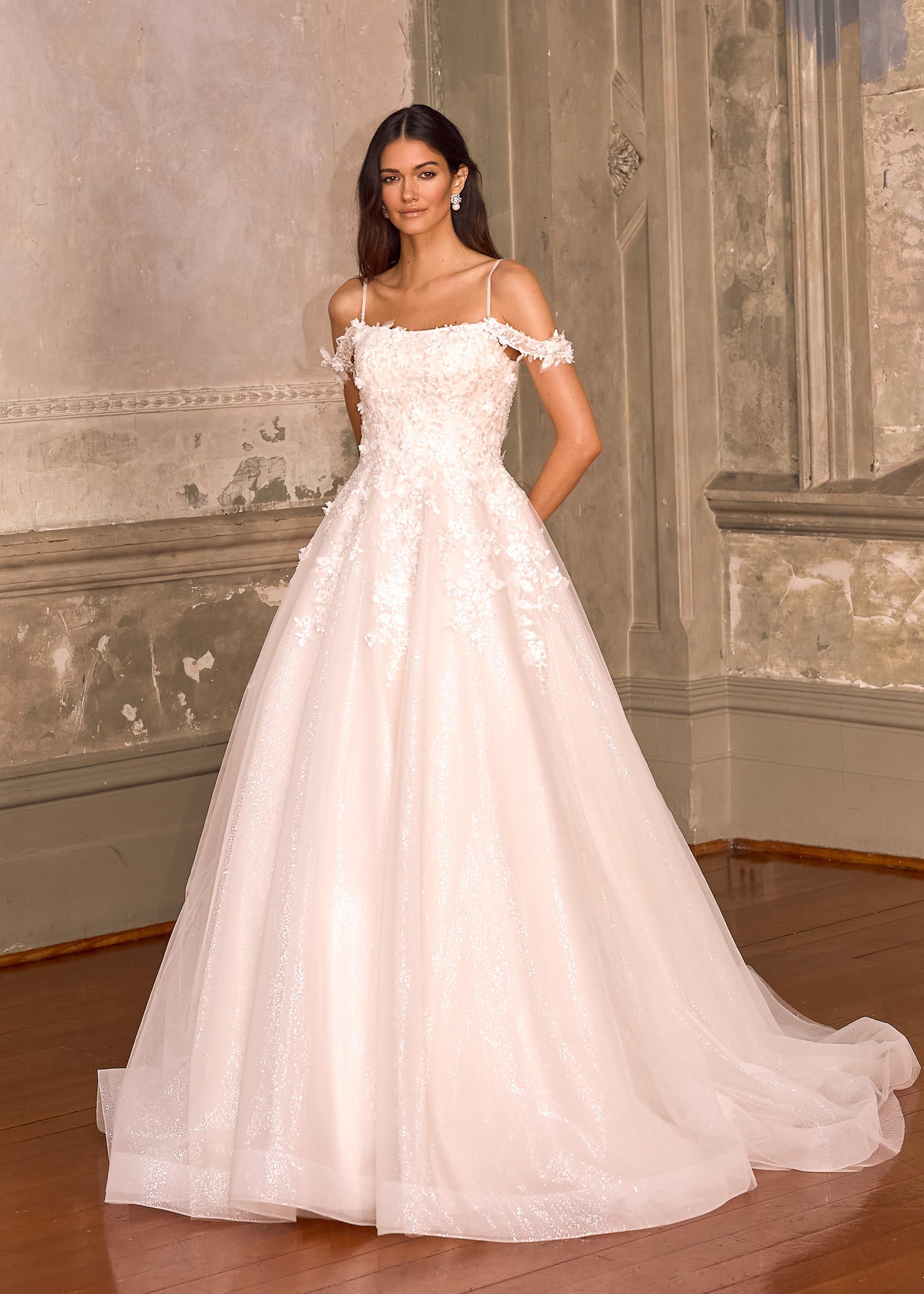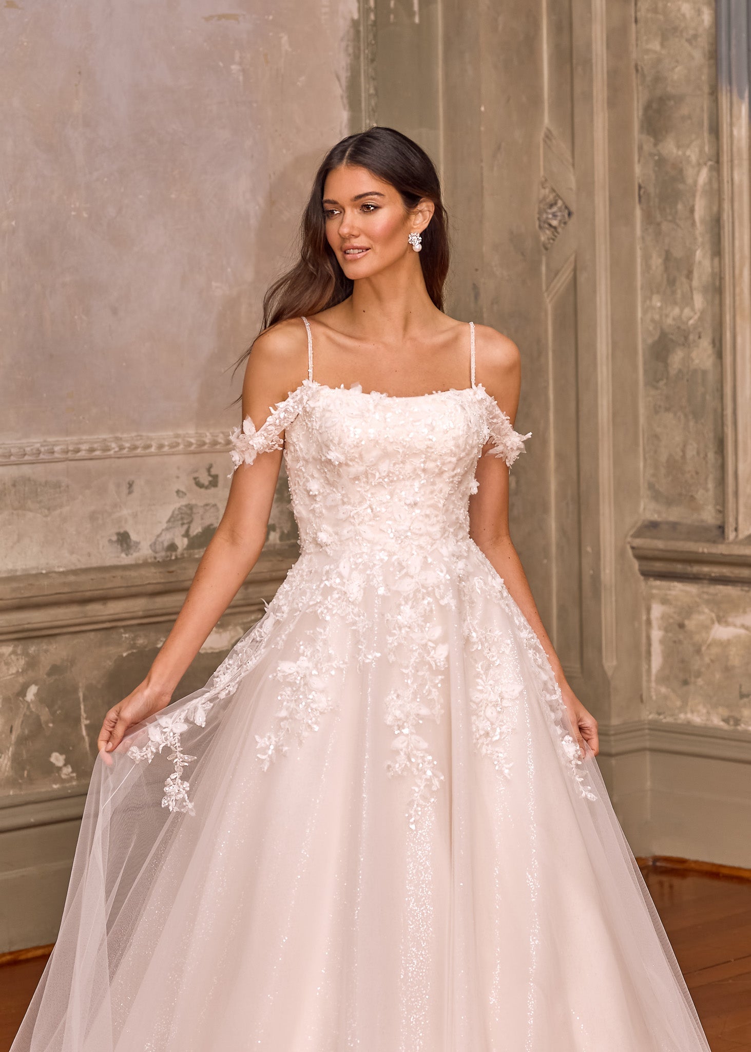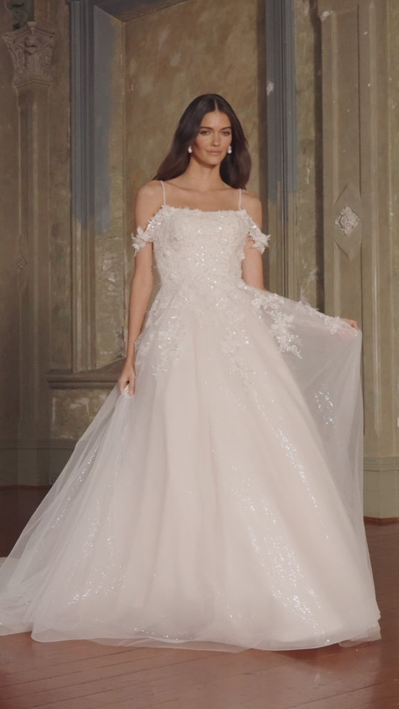 The Stella wedding dress features a timeless A-line silhouette with a slight scooped neckline. The lined bodice is adorned with generous lace applique and sequinning for some sparkle. The delicate spaghetti straps connect to a soft v-back. The lace appliques elegantly connect the bodice to the skirt, creating a soft cascade past the hips. The skirt is crafted with layered plain and glitter tulle, providing ethereal volume that flows into a cathedral-length train.