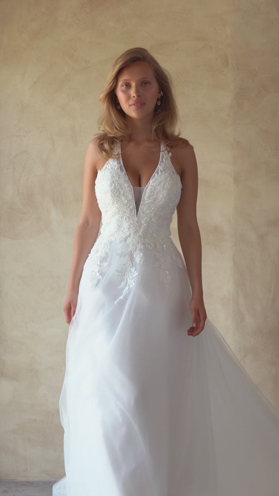 The Theia wedding dress features a modern A-line silhouette. This bridal gown boasts a halter neckline and plunging V-neck adorned with delicate crystal beading. Enhanced with a nude tulle modesty panel, the neckline maintains allure. The meticulously crafted bodice, complete with inner bust cups and boning, ensures a flawless fit and unmatched comfort. The lace applique of the bodice softly cascades into a voluminous plain tulle skirt with a court-length train. This gown promises a dramatic yet elegant entrance.