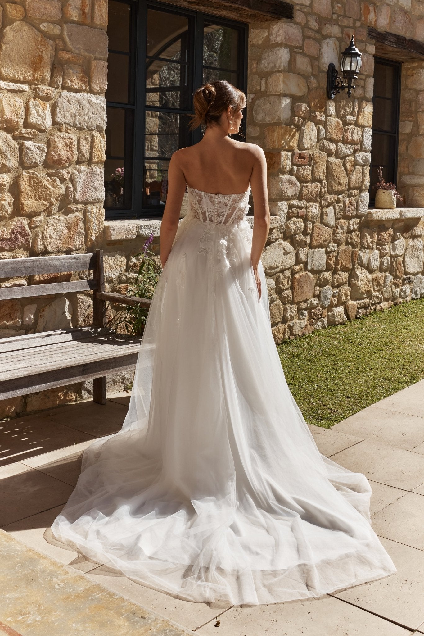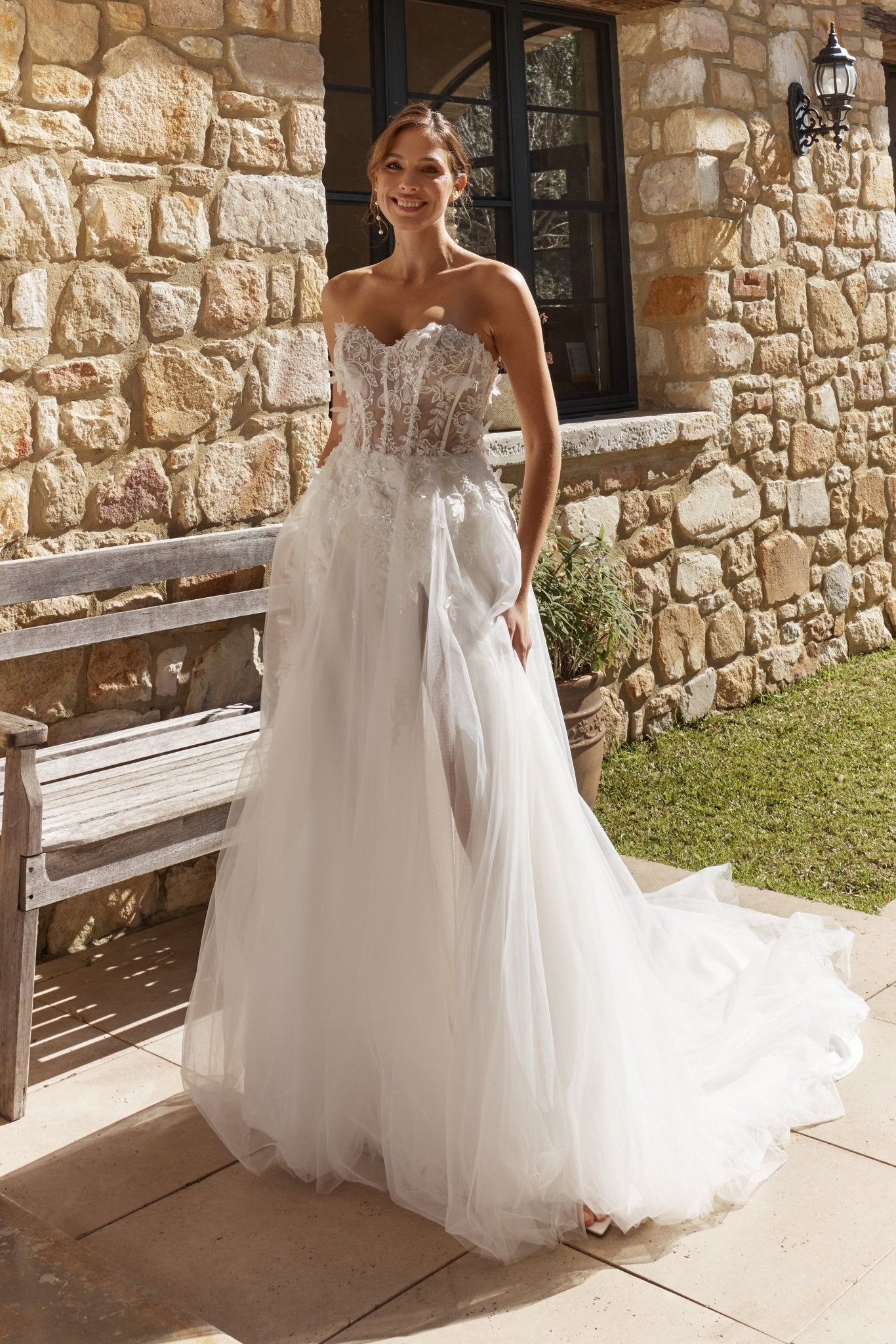 The Addison wedding dress by Tania Olsen Designs is a dreamy A-line gown with a delicate illusion sweetheart bodice, adorned with a combination of lace appliqué and 3D lace. The boned bodice provides structure, while the lace softly trails into the floaty tulle skirt, which features a chapel-length train and a subtle thigh-high slit.