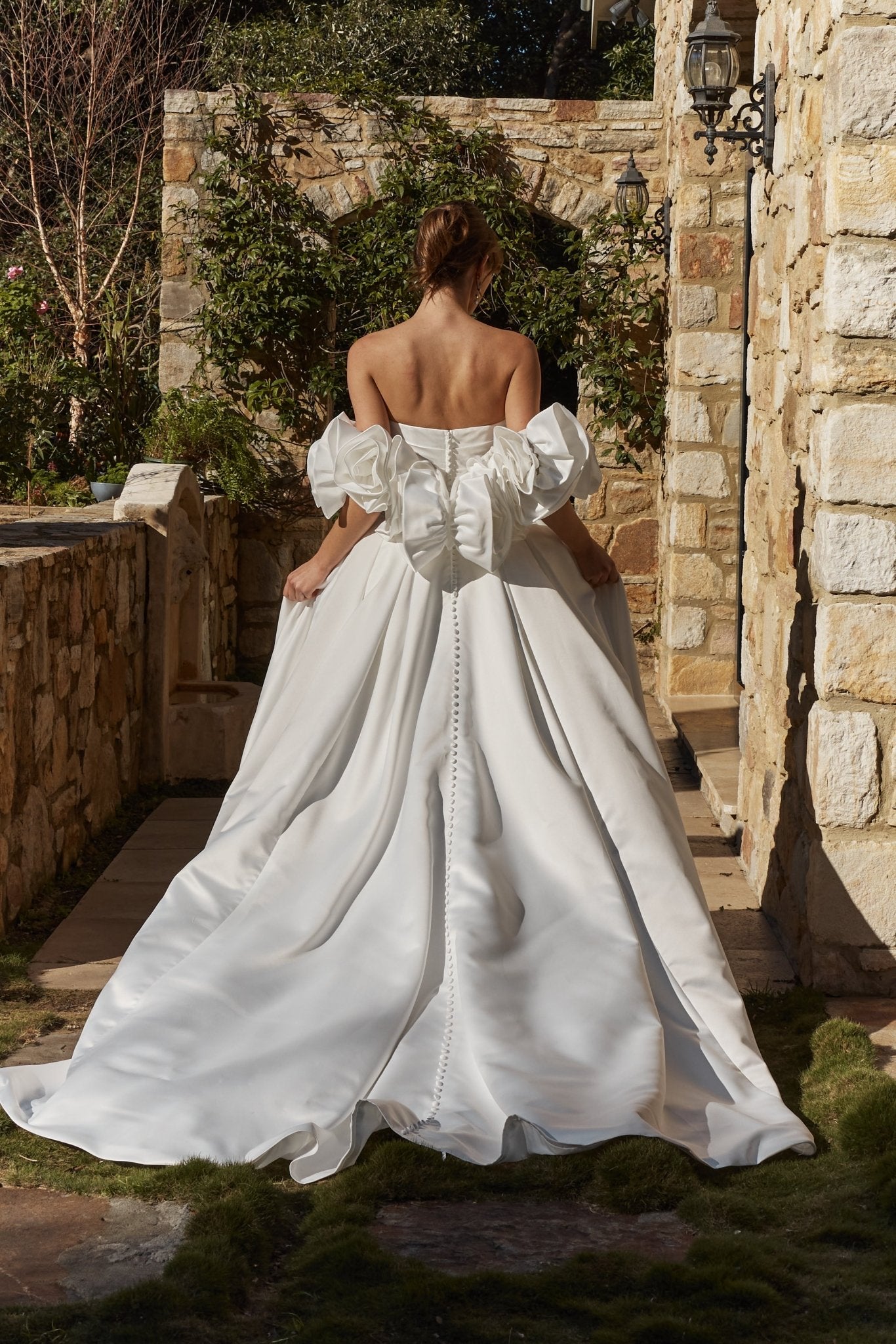 The Alara wedding dress by Tania Olsen Designs is a strapless drop-waist ball gown crafted from luxurious satin. The bodice features a softly scooped neckline with horizontal pleats that continue into the back, finished with loop-and-button detailing that extends into the dramatic cathedral-length train. The voluminous A-line skirt flows beautifully from the hips, and the showstopping feature is a detachable wrap adorned with oversized satin rosettes.