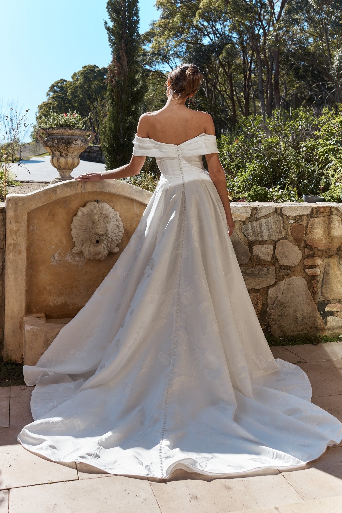 The Athea wedding dress by Tania Olsen Designs is a striking A-line gown crafted from jacquard fabric with a subtle floral print. The bodice features exaggerated pleated off-the-shoulder straps that cross elegantly over the bust, shaping a structured boned corset with internal bust cups. A soft V at the natural waist leads into a flowing skirt with a dramatic cathedral-length train and a thigh-high slit. The back is finished with an invisible zipper and loop-and-button detail for a seamless look.
