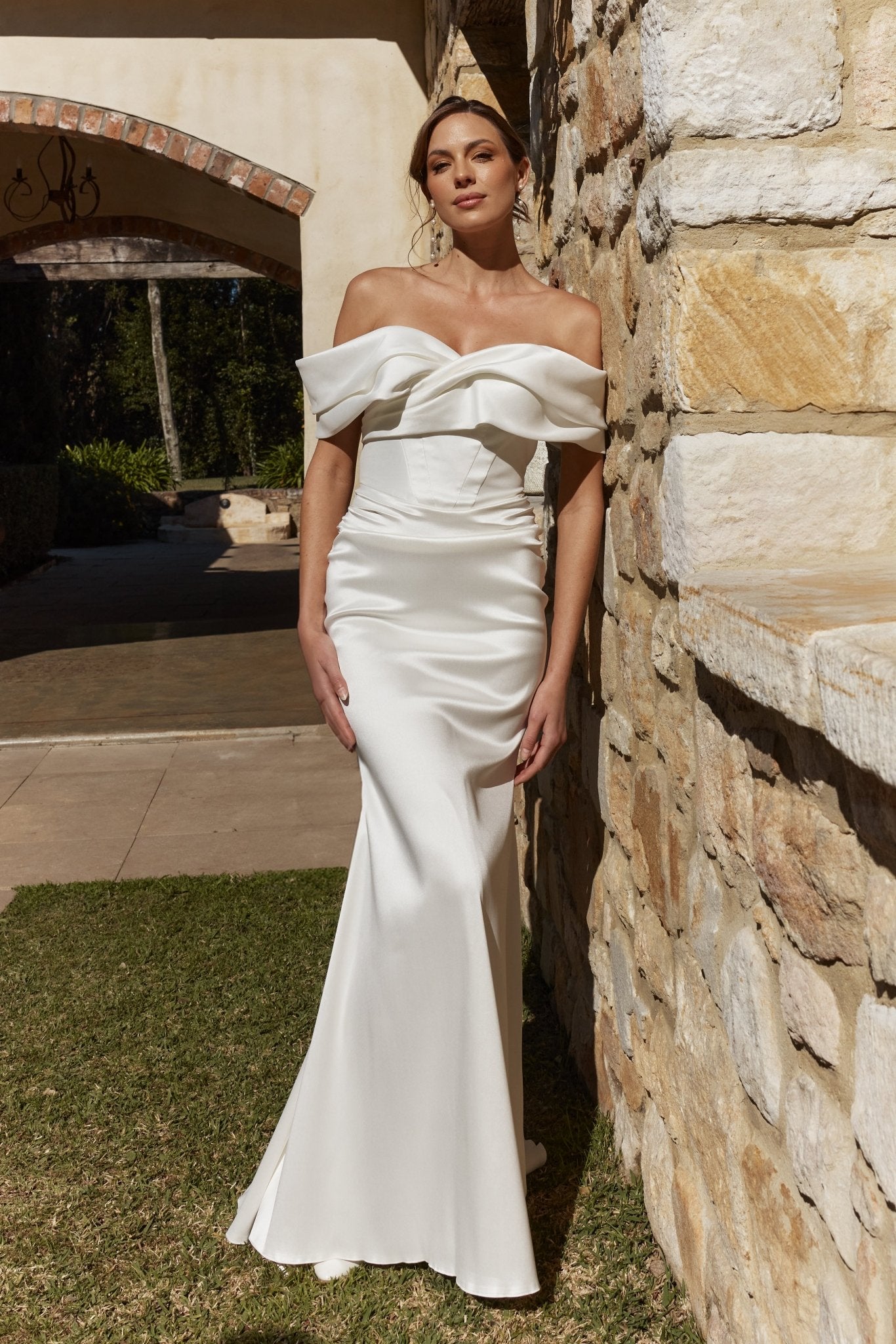 The Aria wedding dress by Tania Olsen Designs is a refined fit and flare design with a classic, flattering silhouette. The exaggerated off-the-shoulder straps cross elegantly over the bust, framing a structured boned bodice beneath. Crafted from luxurious vintage white stretch Mikado, the sleek skirt falls effortlessly into a graceful chapel-length train.