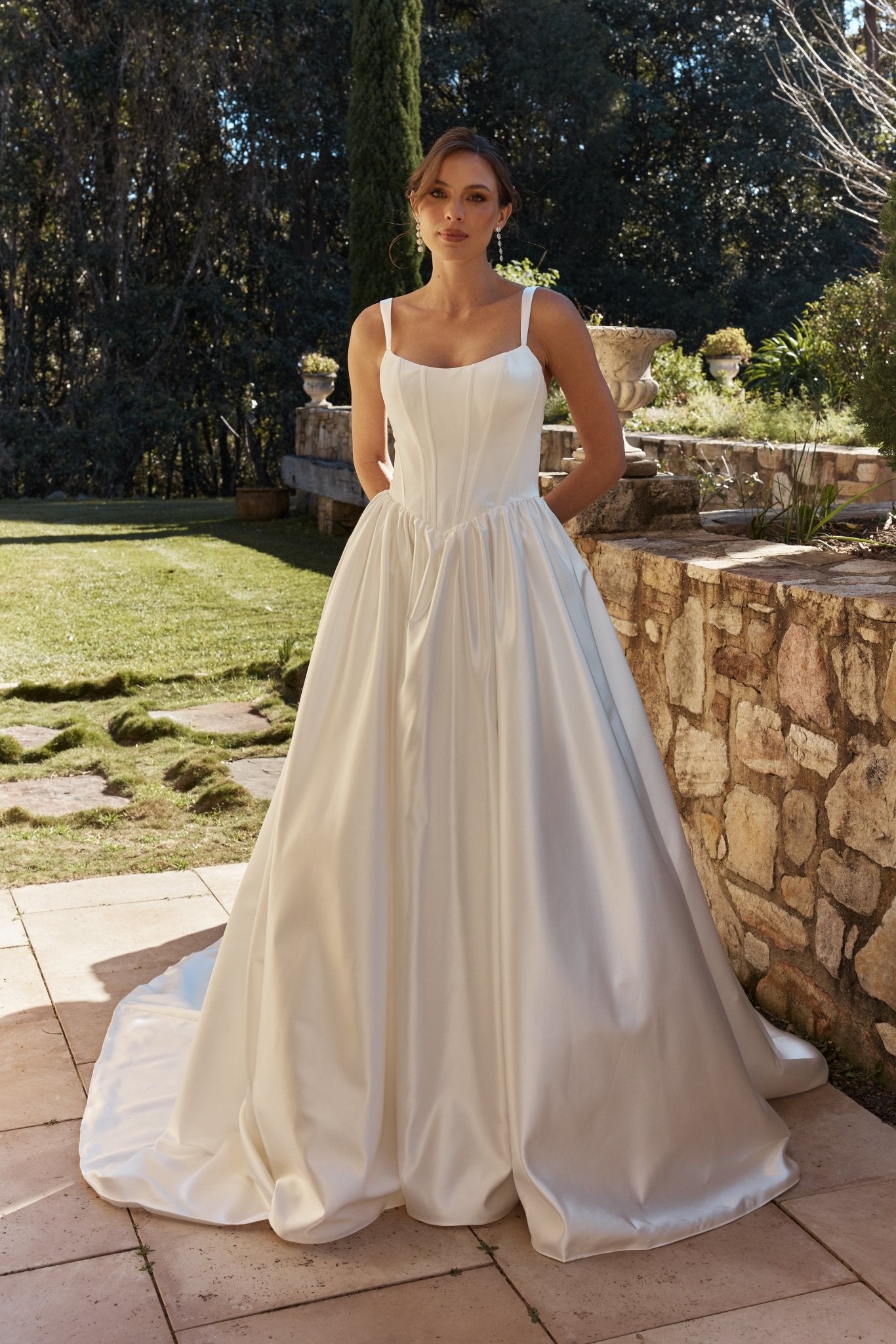 The Arietta wedding dress by Tania Olsen Designs is a basque-waist A-line gown crafted from luxurious satin. The boned bodice features a soft scoop neckline with delicate straps, leading into a gathered skirt. The back is finished with a loop-and-button closure that extends gracefully into a dramatic cathedral-length train.