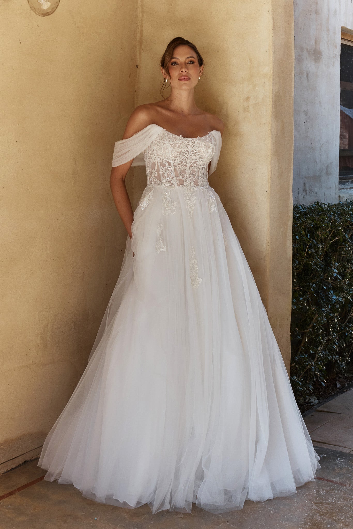 The Aubrey wedding dress by Tania Olsen Designs is a romantic A-line gown featuring a scooped neckline bodice crafted from illusion lace. Gathered off-the-shoulder straps frame the shoulders, while the lace gently trails into the voluminous gathered skirt. The skirt flows into an illusion cathedral-length train, and the back is finished with an invisible zipper for a seamless look.