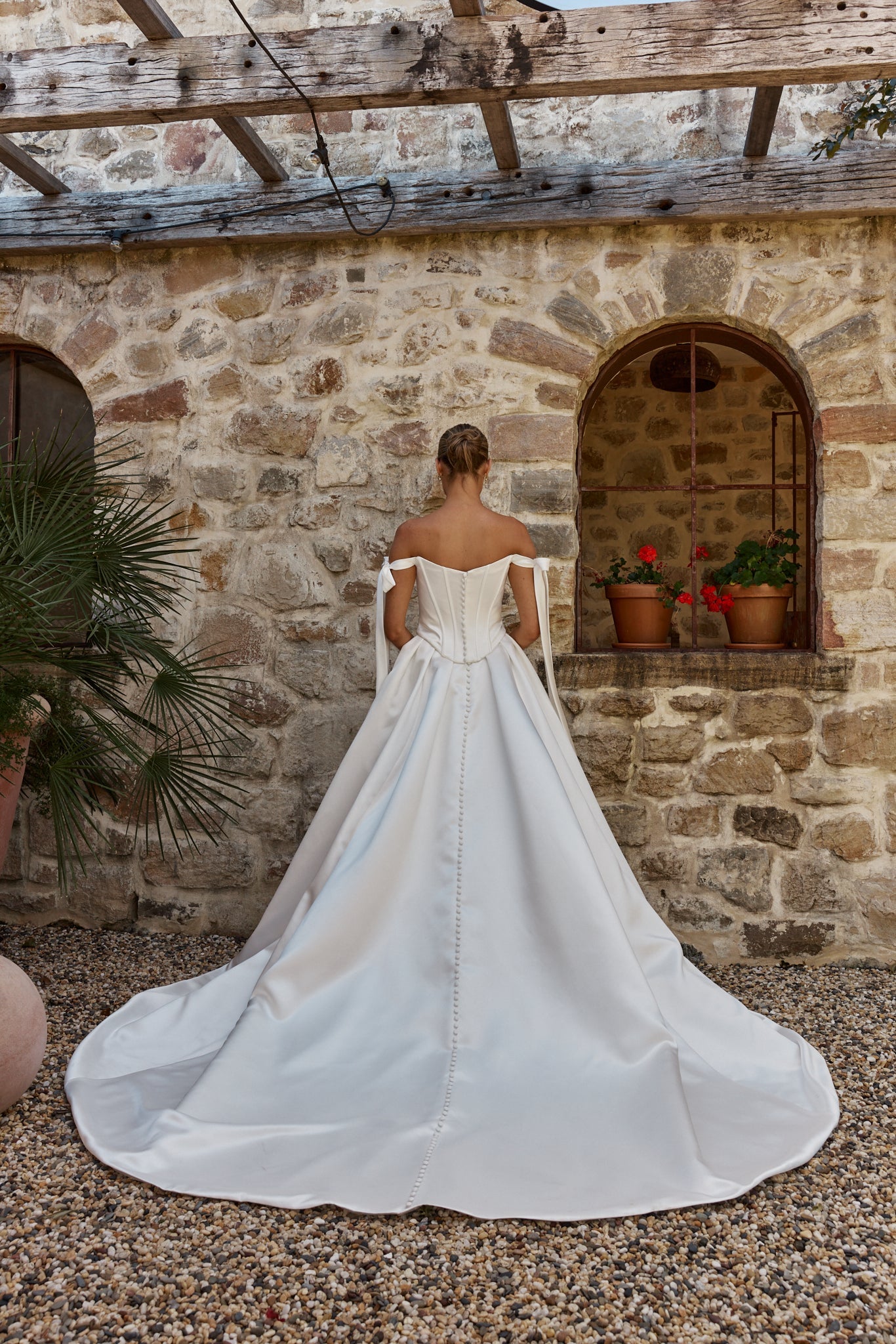 The Bonnie wedding dress is a statement two-piece design. The corset features a structured boned bodice with a straight neckline, a subtle dip at the back, and romantic off-the-shoulder bows. Draped crystal bead strands add a touch of sparkle and movement. The pleated full skirt completes the look with a cathedral-length train, finished with loop-and-button detailing that trails seamlessly from bodice to hem.