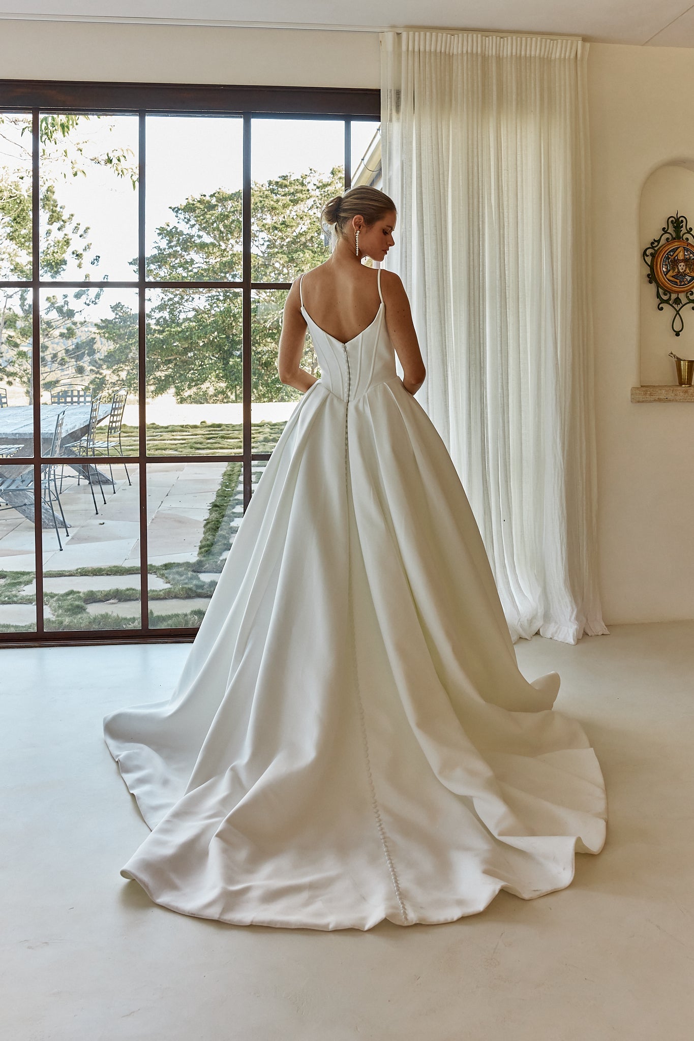 The Brynn wedding dress is a Mikado ball gown with a rounded basque waistline and peaked bust cups adorned with strings of pearls. Off-the-shoulder pearl straps frame the shoulders, adding an elegant touch. The structured skirt features pleating at the hips and extends into the back, flowing into a cathedral-length train. The back is finished with a concealed invisible zipper and decorative pearl buttons that trail from the bodice to the hem.